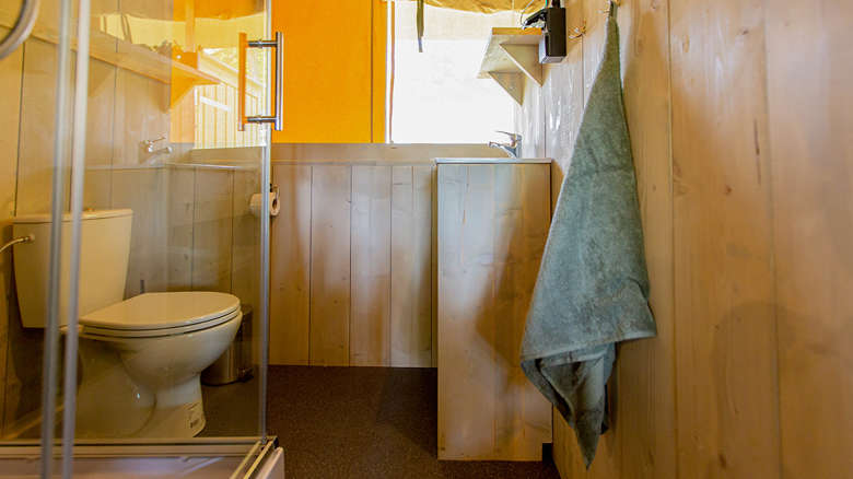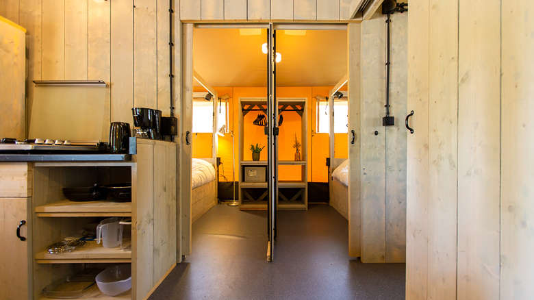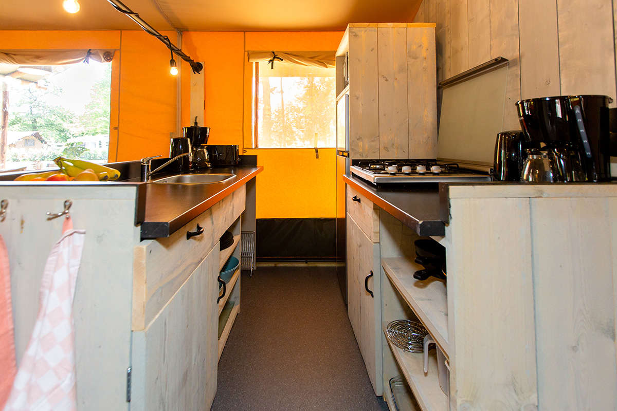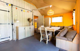 On the lovely Hertenkamp site, along the edge of the water is our largest Lodge tent: the Family Lodge. This luxury Lodge tent sleeps twelve people, making it ideal for a full-on glamping experience with the whole family or a group of friends.