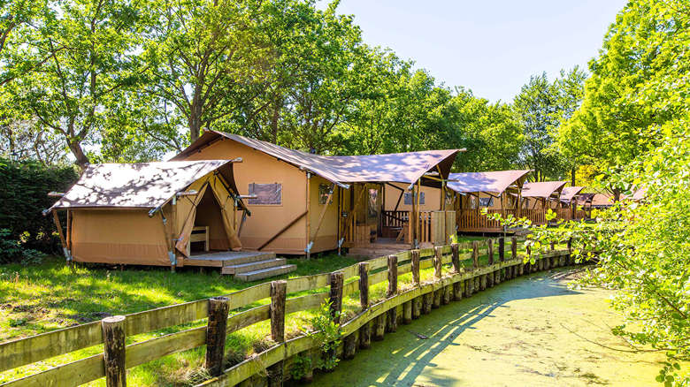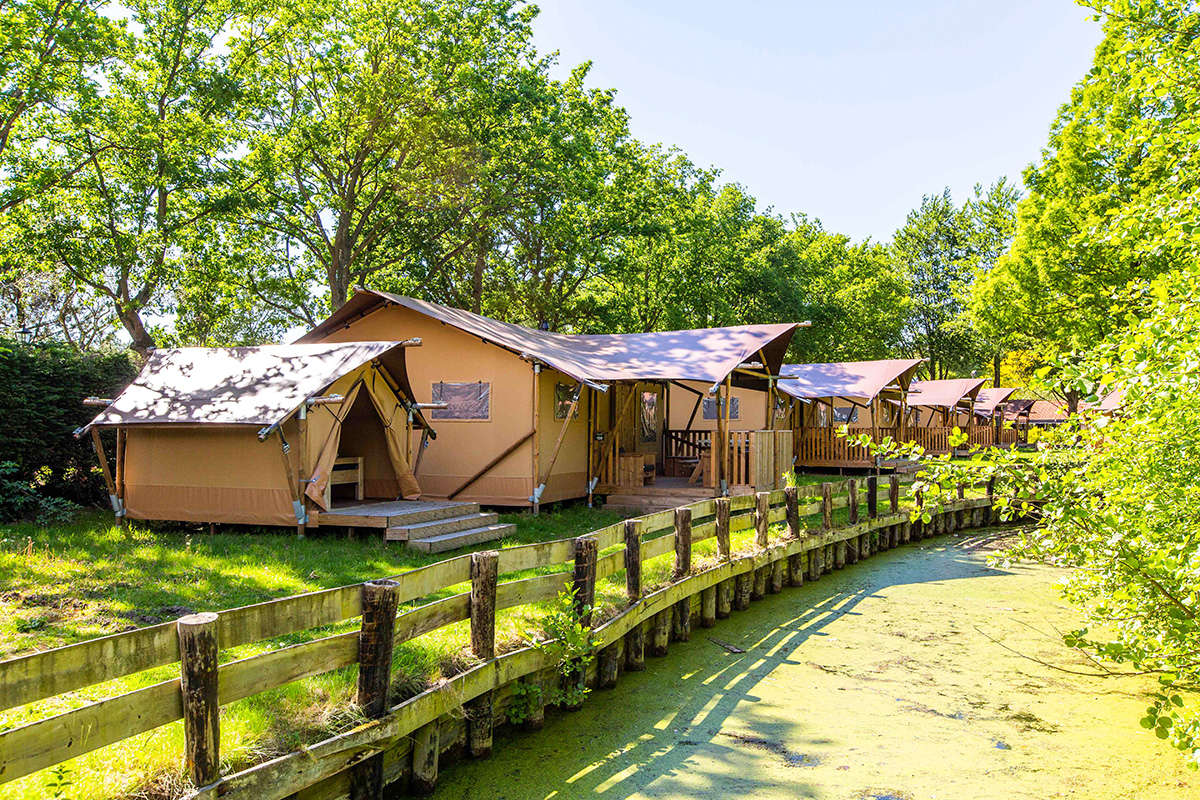 Enjoy a comfortable comping holiday in our newest 5-person Luxury Lodge Tents! These lodges come with all amenities. You will enjoy the outdoors life to its full extent thanks to the scaffolding wood furniture and the covered veranda.