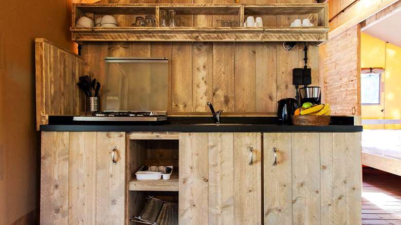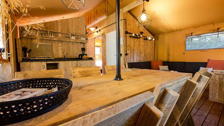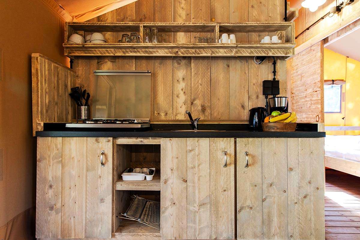 These Luxury Lodge Tents for 5 people come with a kitchen equipped with a fridge, freezer compartment and coffee maker. There’s a spacious seating- and dining area. The Lodge Tents also have a separate toilet with a washstand.