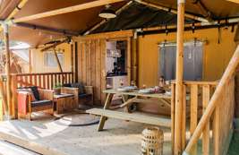 A spacious veranda with a covered part is attached to our new Lodge Tents. The veranda has a picnic table and two lounge chairs, for ultimate enjoyment of the outdoors. When you want to take a shower there’s a sanitary building only a minute away.