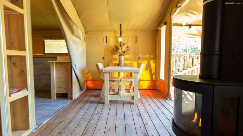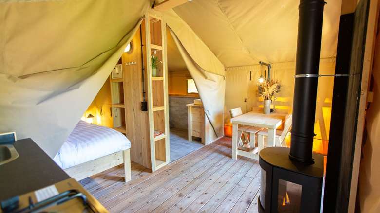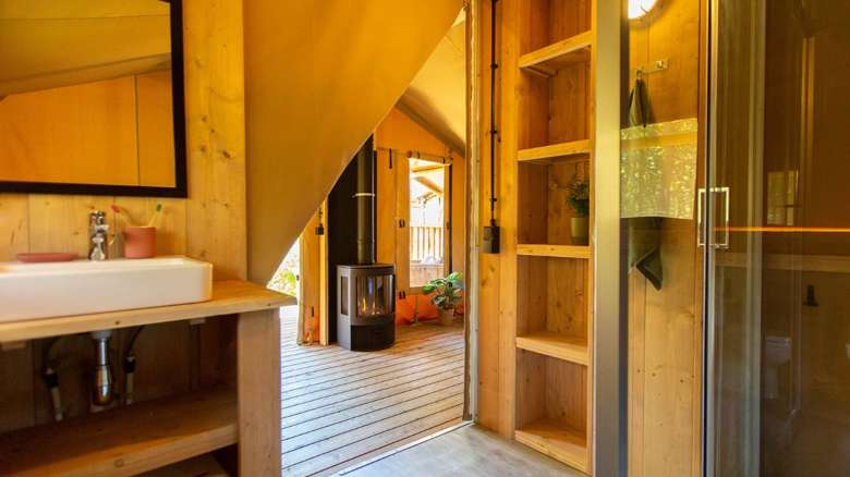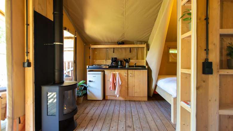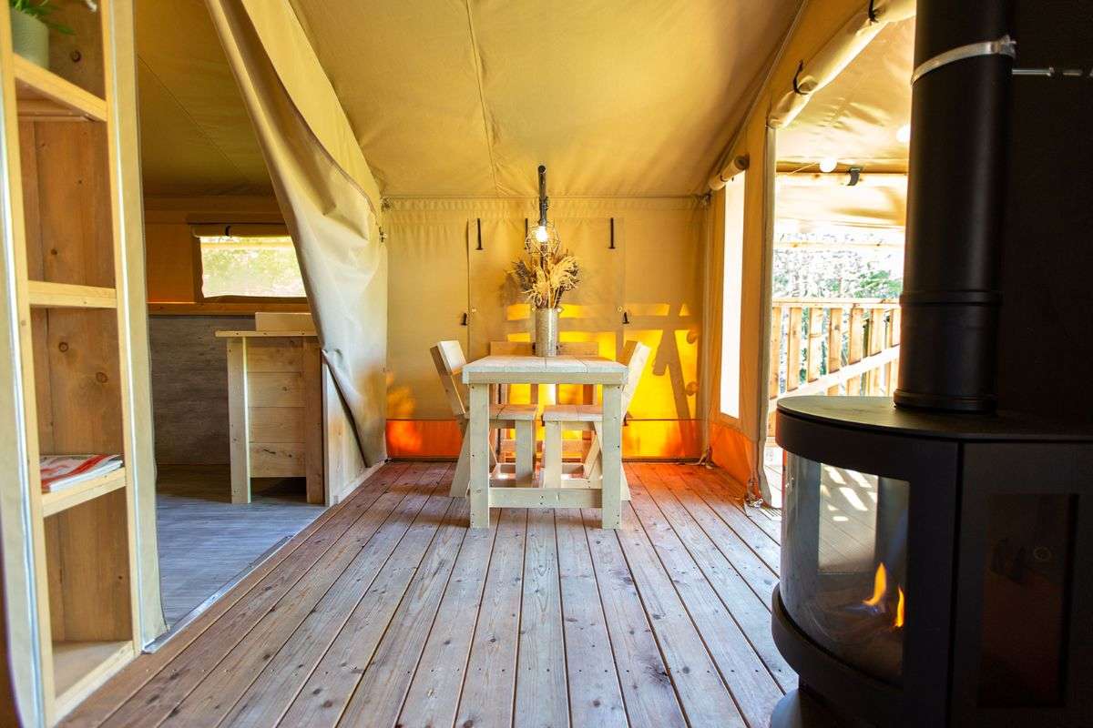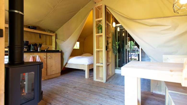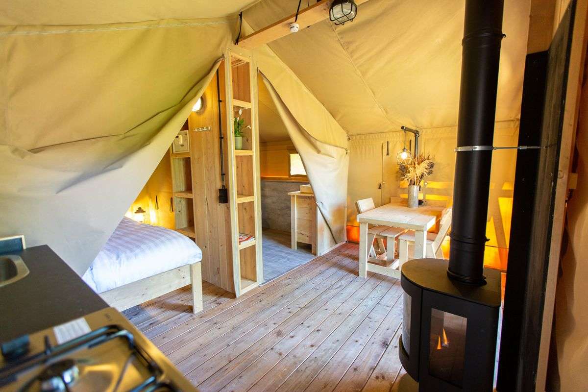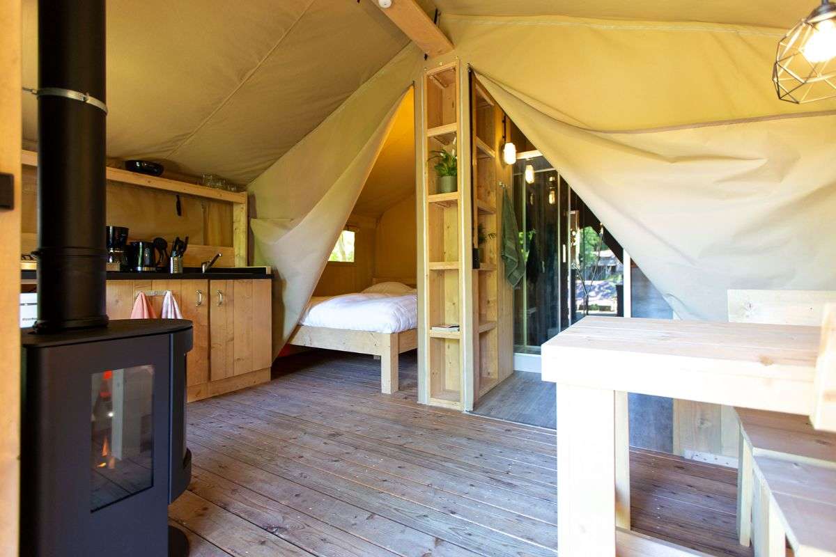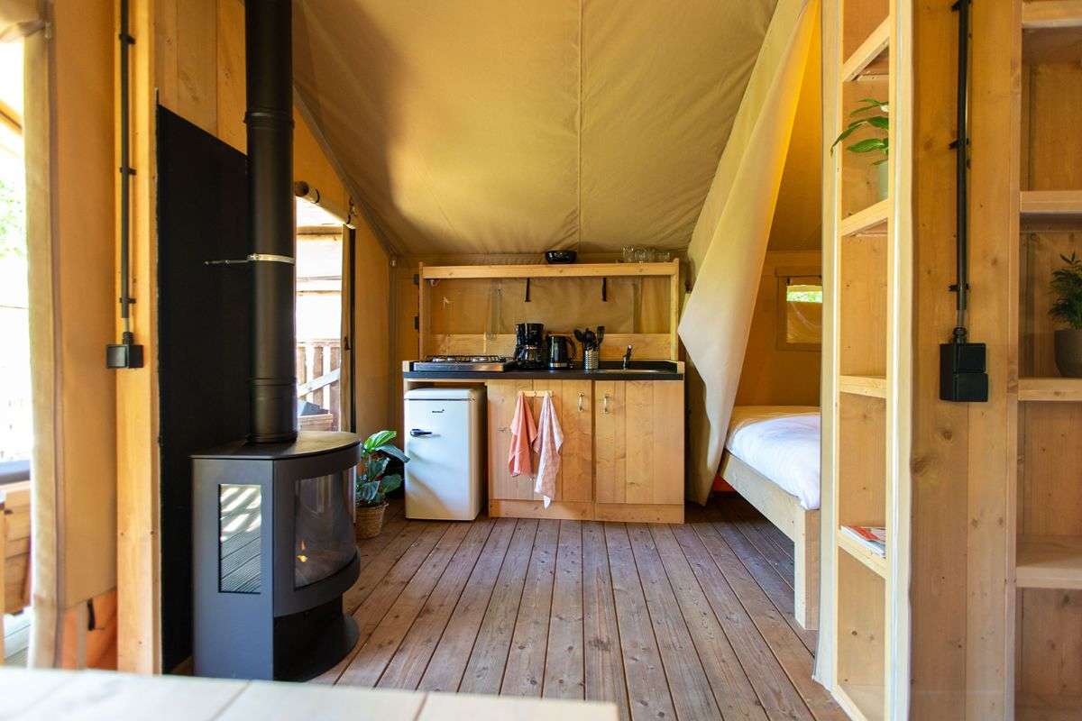 The Luxury Lodge tent for two people has everything you will need during your holiday. The tent is equipped with a private bathroom with shower, toilet and washbasin, a compact fully equiped kitchen with gas hob and fridge, an eating area, a decorative fireplace, a bedroom with a double bed with 2x single mattresses and duvets, and plenty of cupboard space. The beds feature luxurious mattresses. Unfortunately, it is not possible to place a cot in the bedroom.