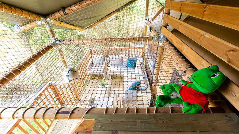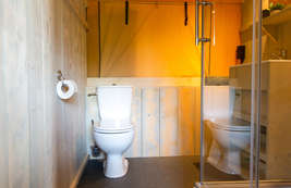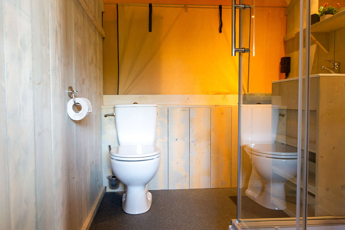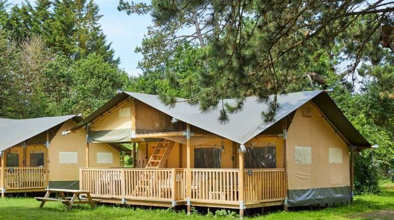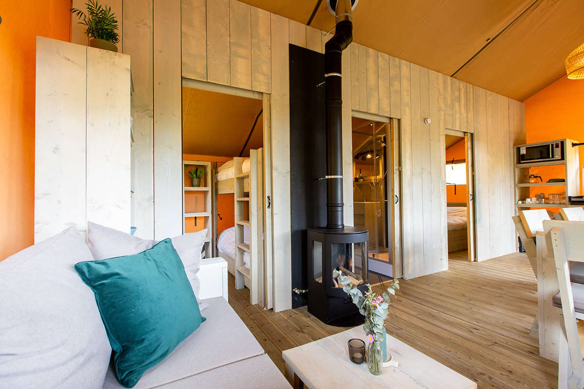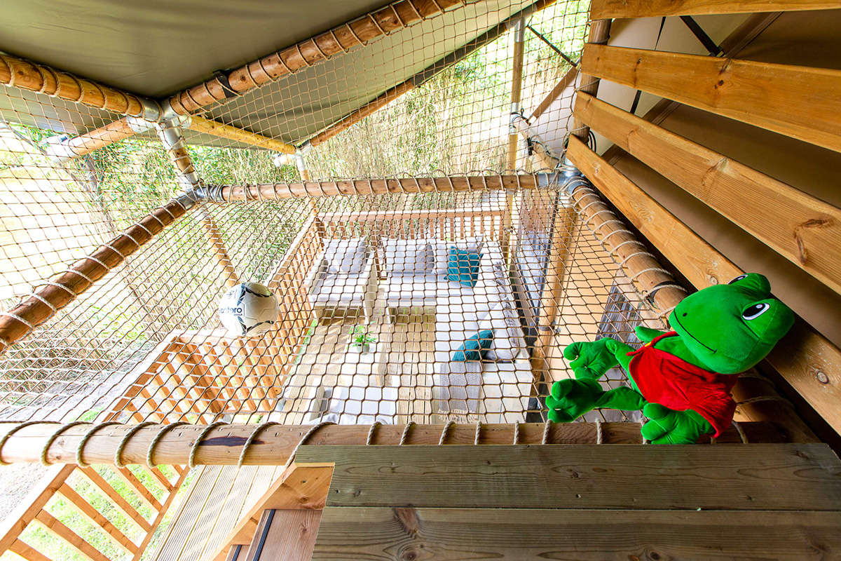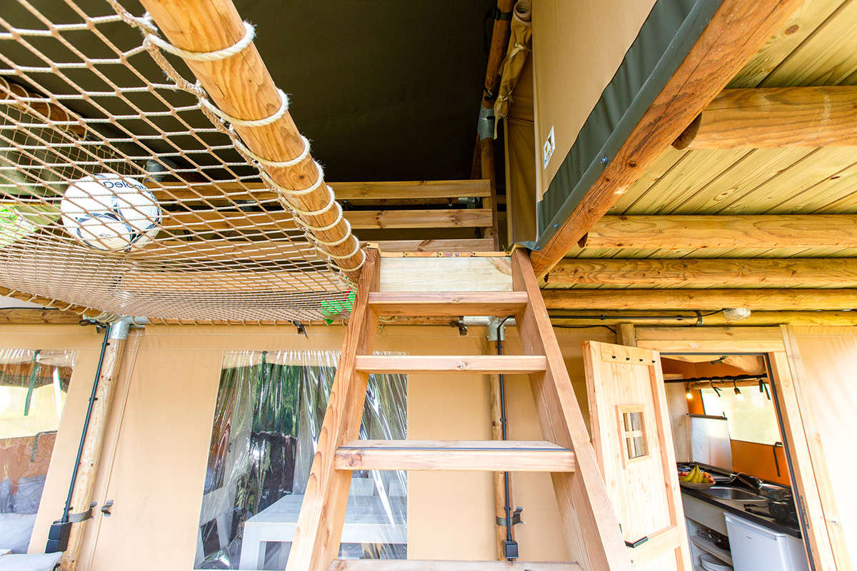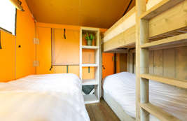 The Lodge tent has three bedrooms. Two bedrooms are found on the ground floor: one with a double bed and one with a single bed and bunkbed. What makes the Ranger Lodge so special is the extra two-person tent under the apex of the tent, with a play-hammock next to it. Especially fun for children as it gives the feel of sleeping in a treehouse. All beds feature luxurious mattresses. Unfortunately, it is not possible to place a cot in the bedrooms.