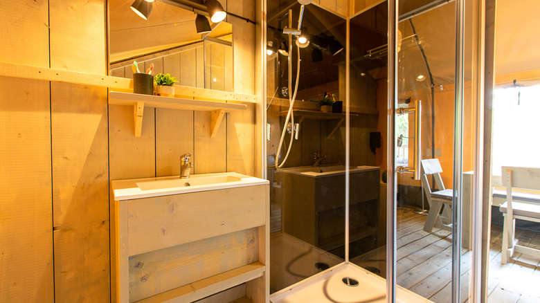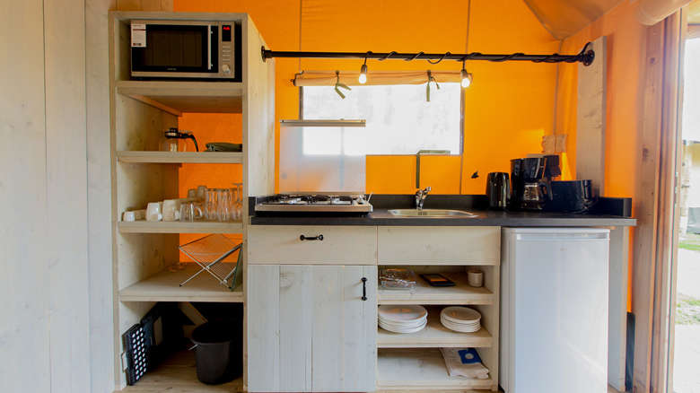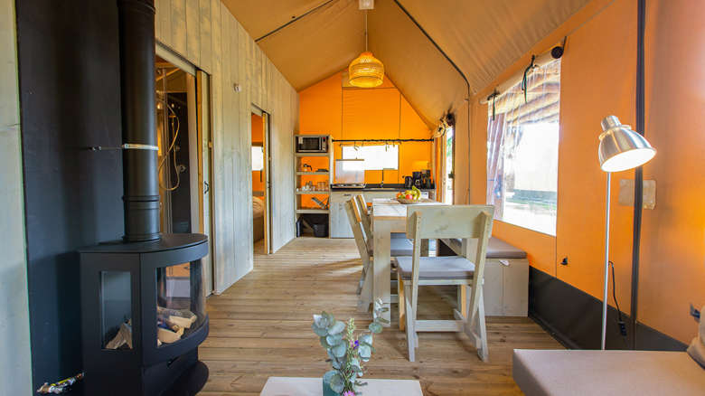 The Ranger Lodge makes maximum use of the space and is equipped with everything you need. You have a private bathroom with shower, toilet and washbasin, a fully equipped kitchen that includes a gas hob, microwave and fridge, a decorative fireplace, and a cosy living and eating area. The living area has large windows that allow plenty of natural light in.