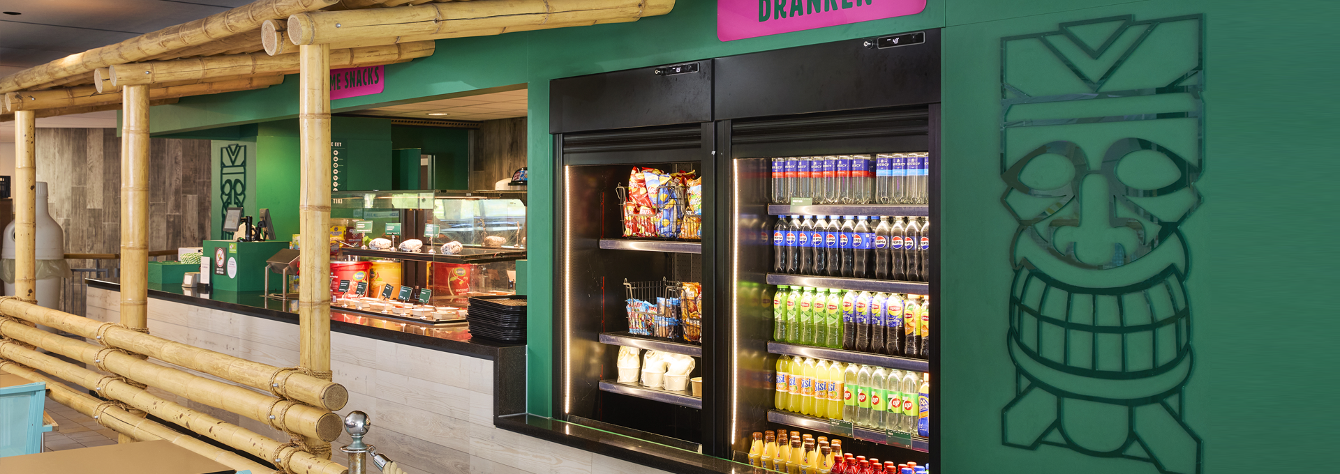 Take a break from the splashing fun and enjoy fresh juices, smoothies, milkshakes, La Place Restaurant coffee, homemade pastry and fruit to raise your energy level. For those who like well-seasoned foods, the restaurant offers Flemish chips with mayonnaise, croquettes and many other snacks. From the restaurant high up in the complex you have a unique view over the Tiki Pool. In good weather the terrace is opened, for you to enjoy your lunch in the warmth of the sun. This restaurant is only accessible for guests of the Tiki Pool.