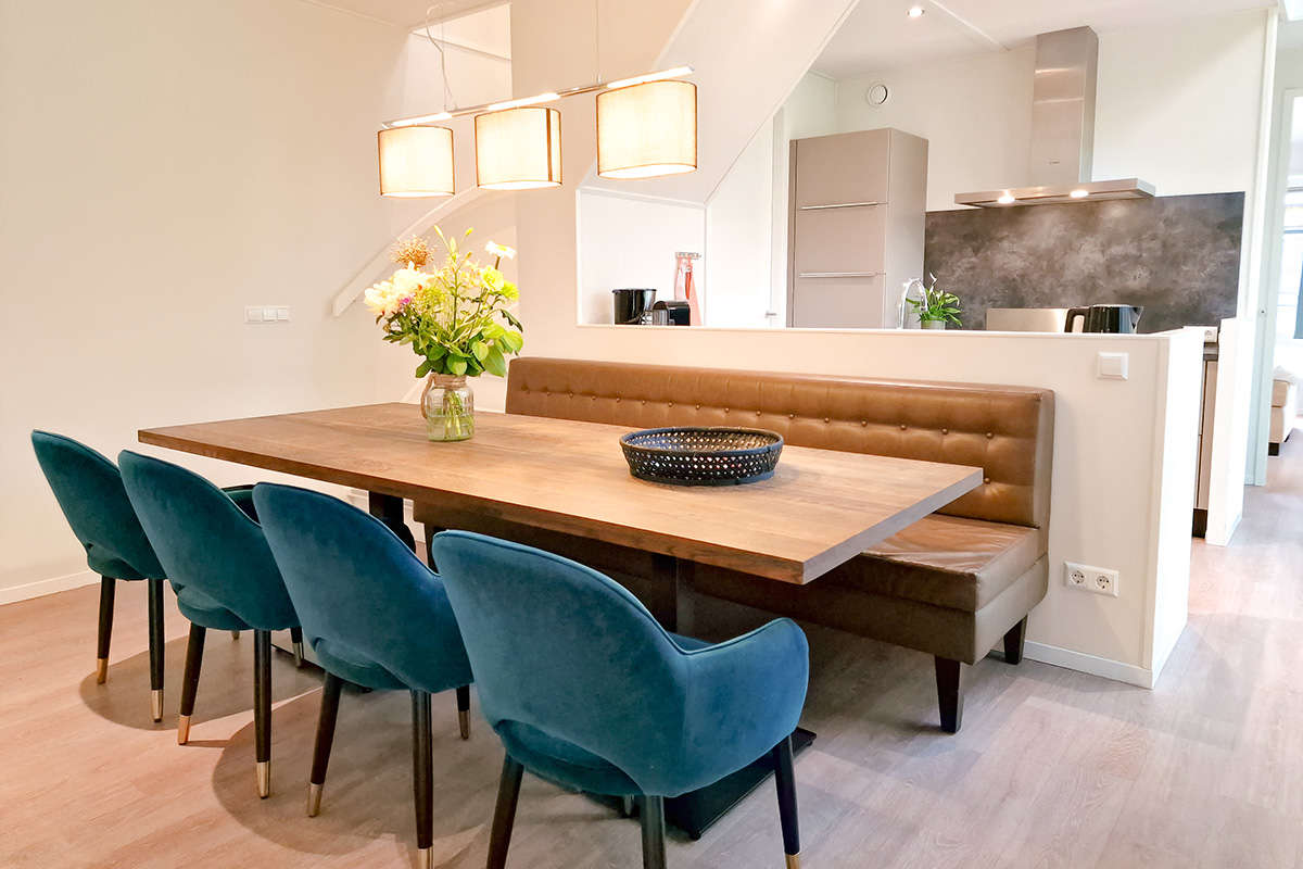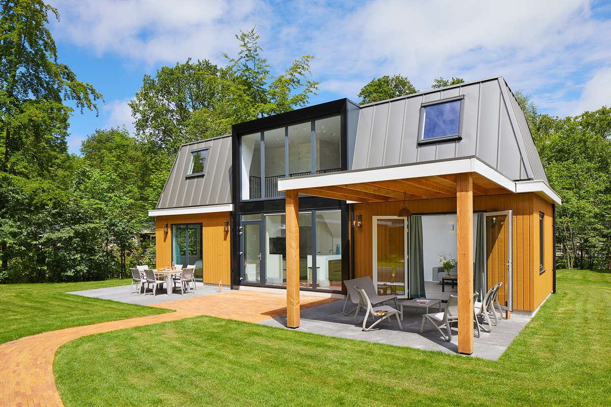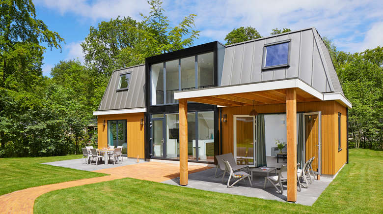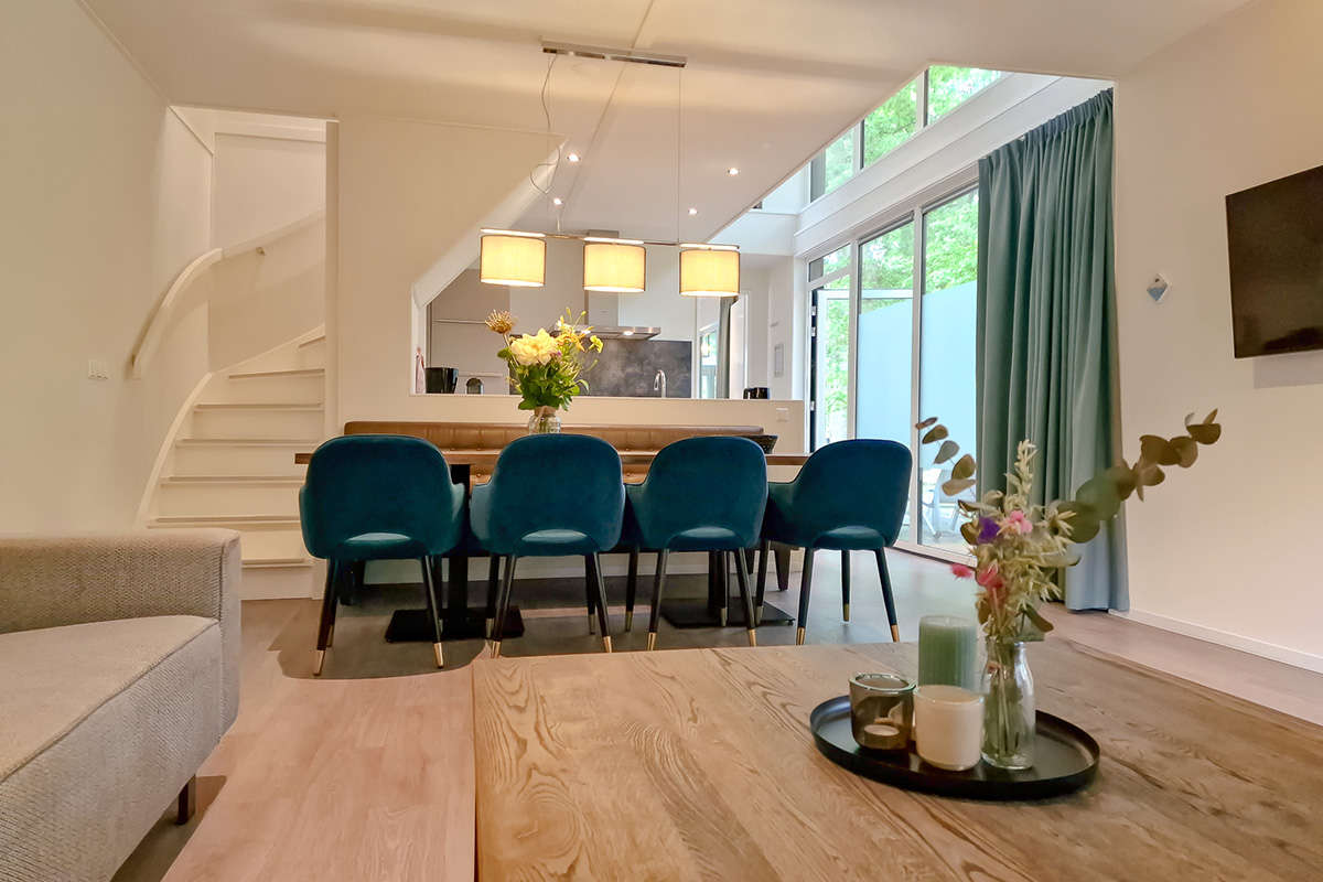 The 8-person Premium Plus Duingalow has very large windows ensuring plenty of light, giving you the feeling of being outside. Nice weather outside? It’s easy to move to your terrace next to the living room via the patio doors. There is a covered area with spacious seating. A lovely place on a rainy day as well!