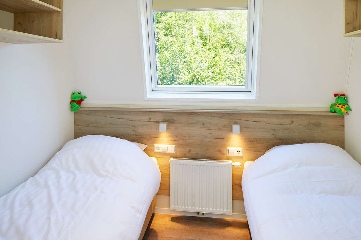 The Premium Plus Duingalows for 8 people consists of two floors. You will find the spacious living room with lounge area and dinner table, as well a fully equipped kitchen with coffee maker, combi-microwave and dishwasher on the ground floor. There’s a separate toilet and luxury bathroom with walk-in shower, sink, an infrared sauna as well. The ground floor also has the master bedroom, with comfortable box spring beds.