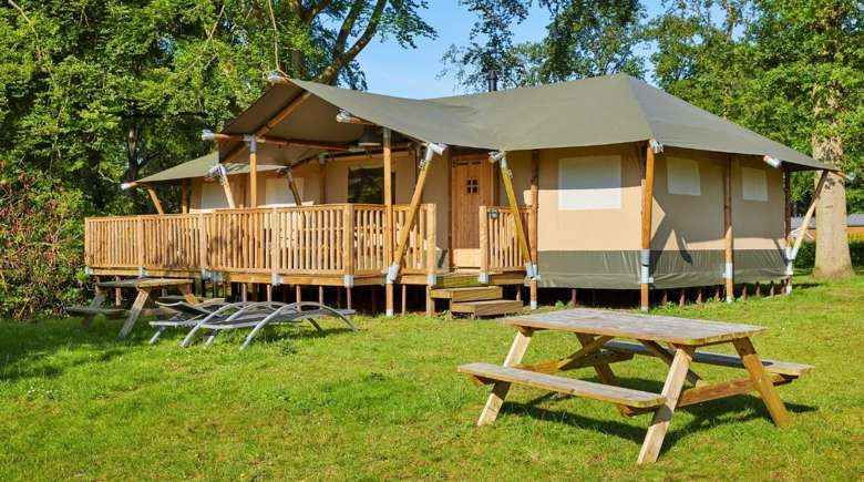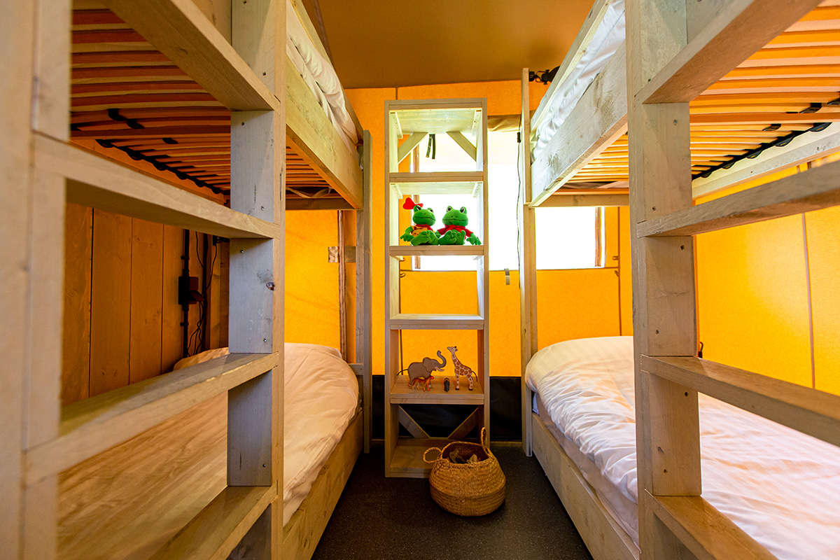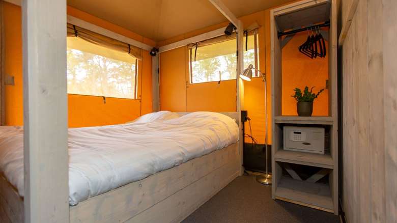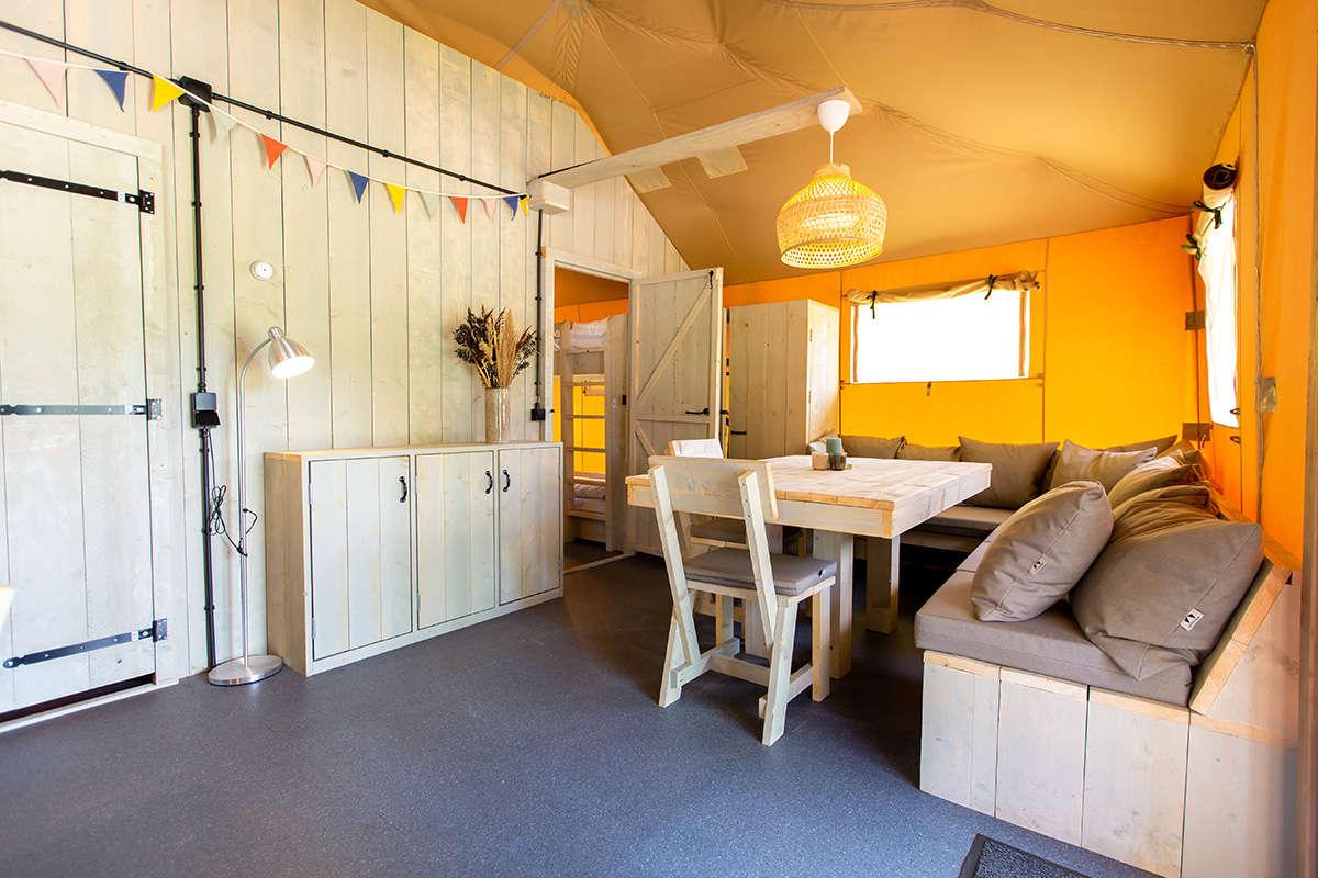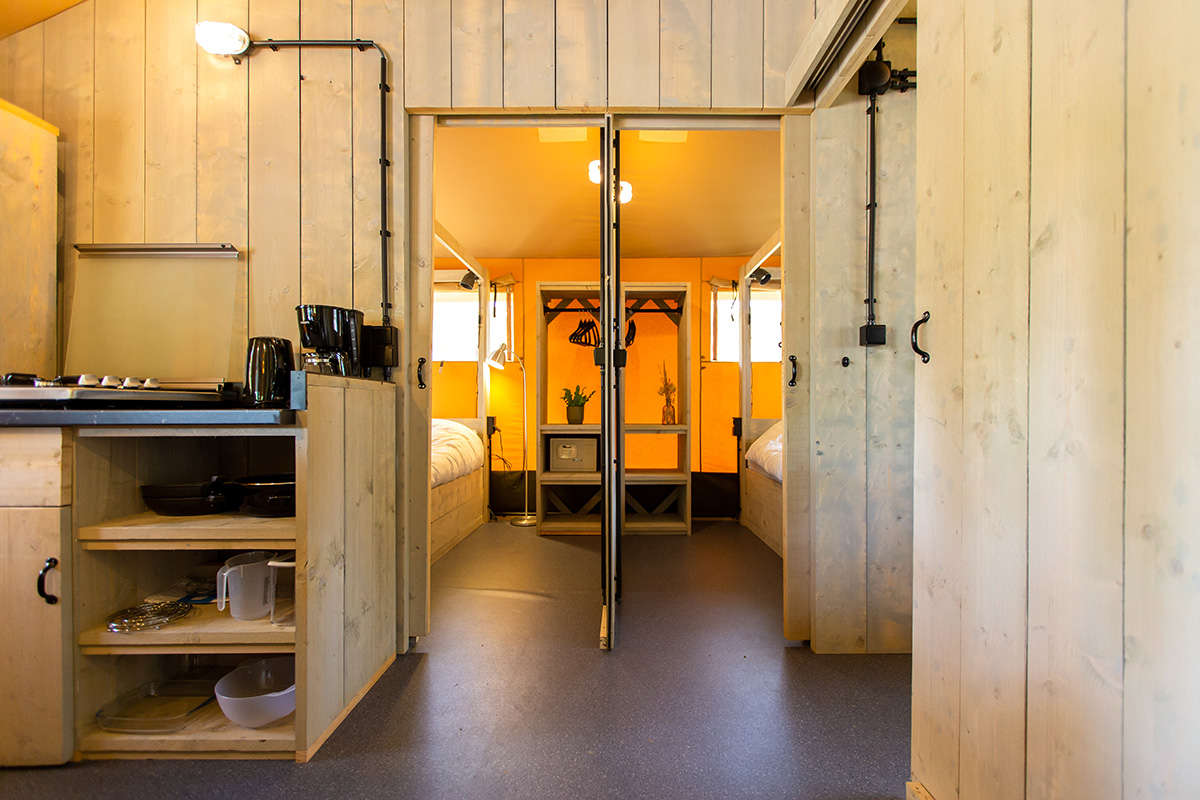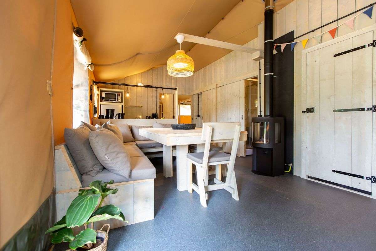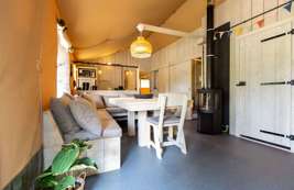 On the lovely Hertenkamp site, along the edge of the water is our largest Lodge tent: the Family Lodge. This luxury Lodge tent sleeps twelve people, making it ideal for a full-on glamping experience with the whole family or a group of friends.