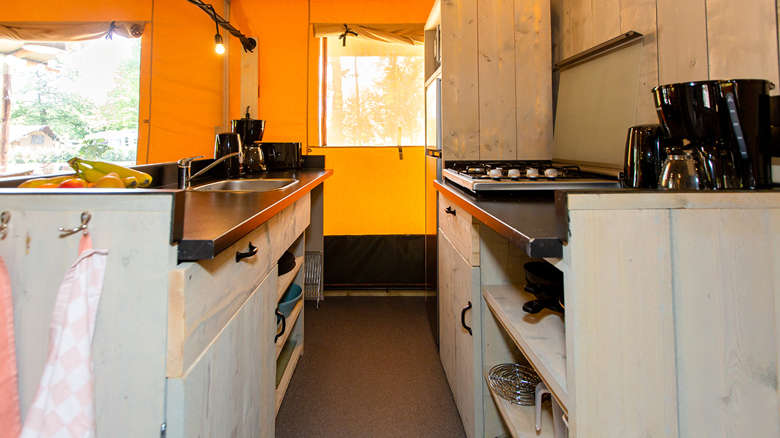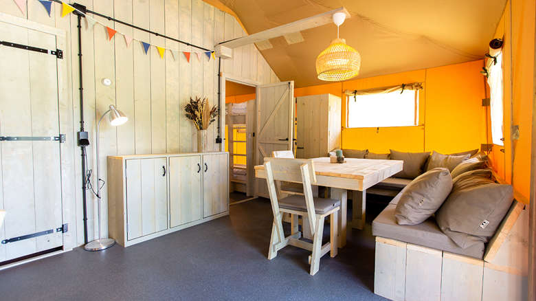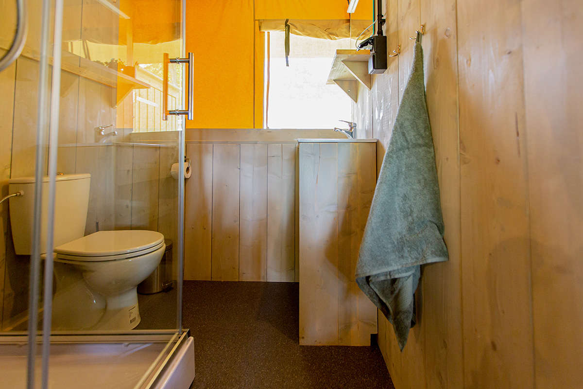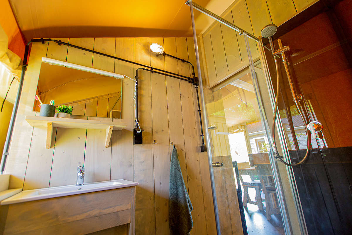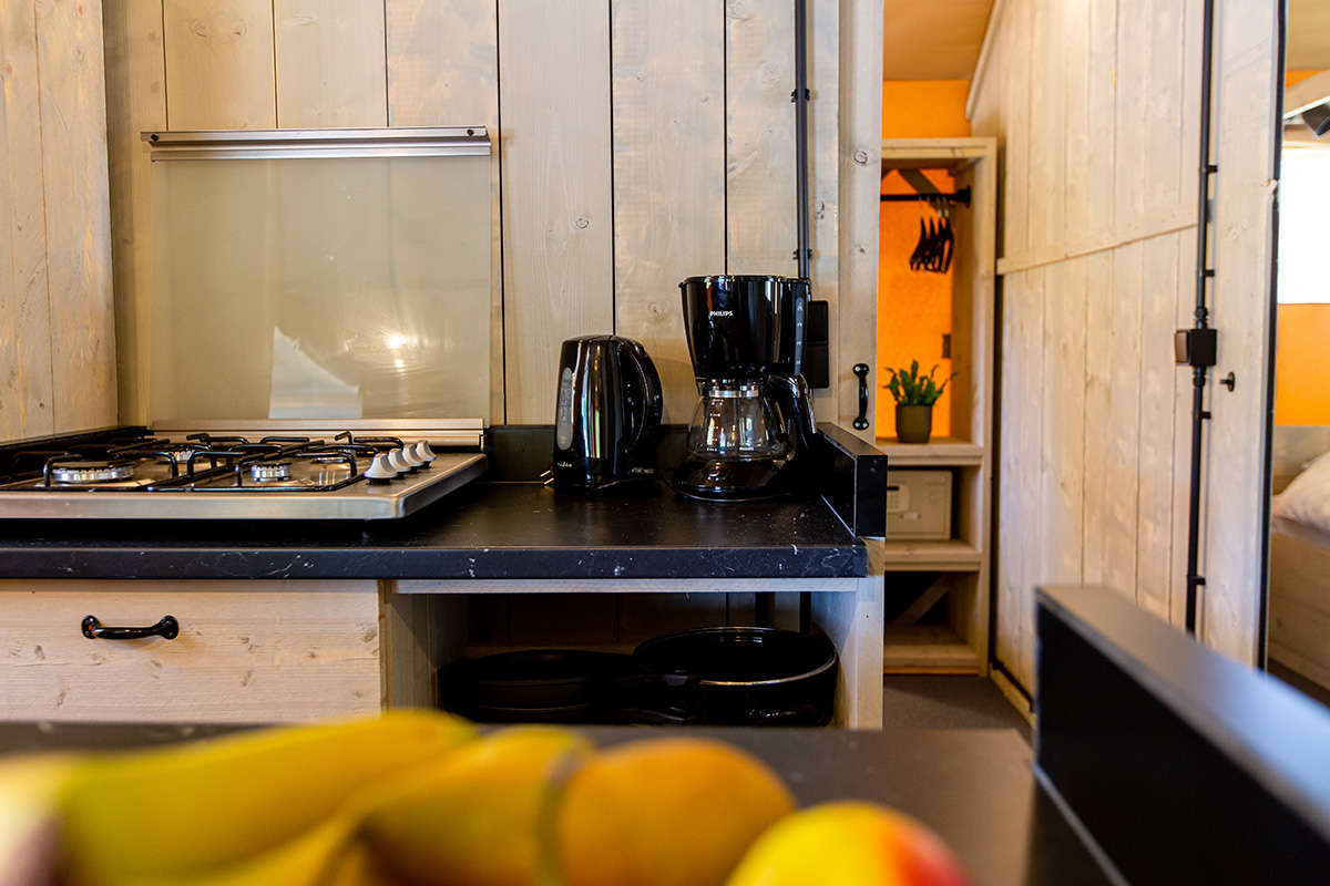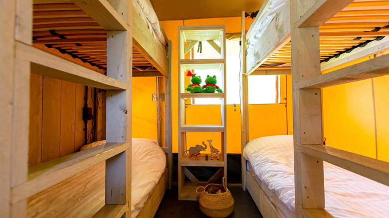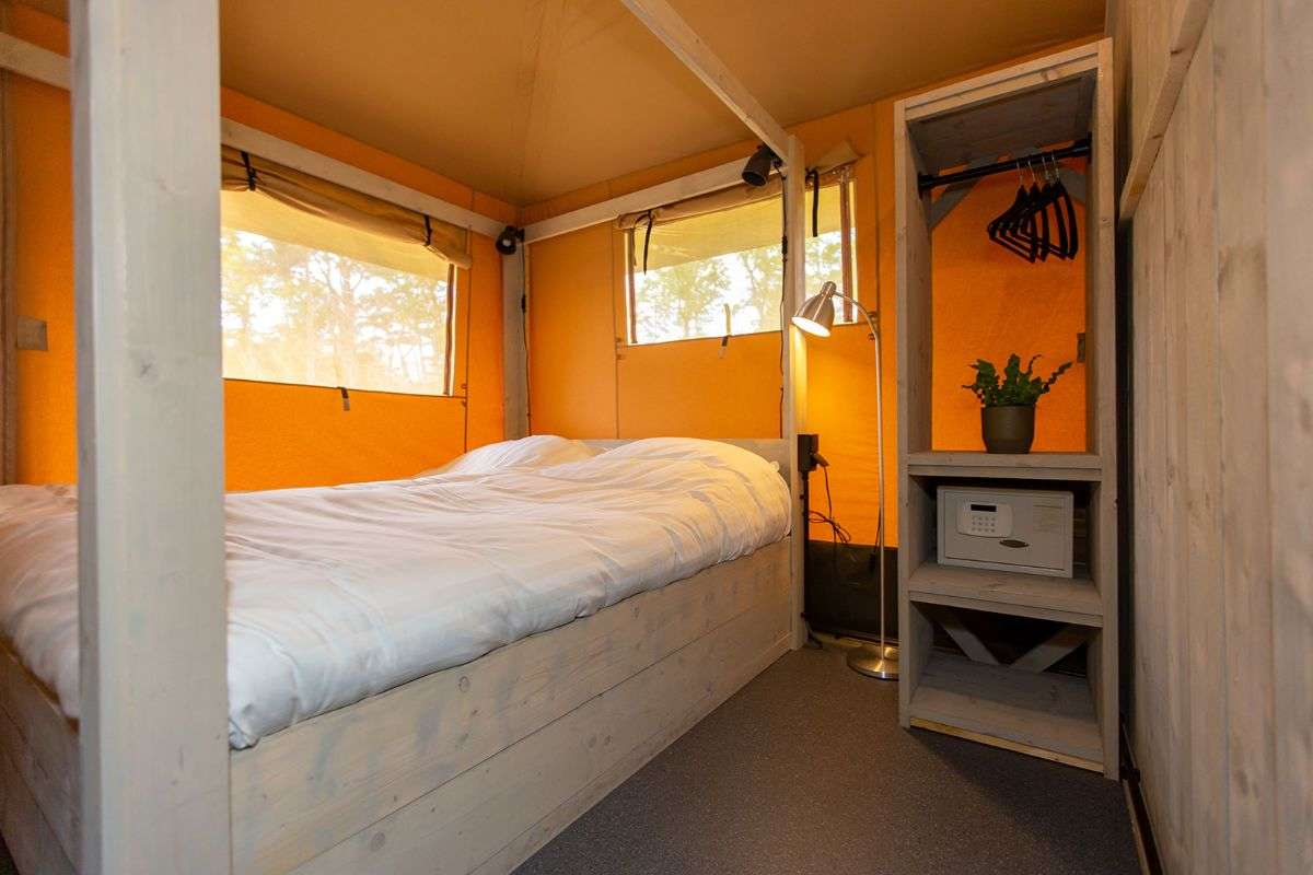 On the lovely Hertenkamp site, along the edge of the water is our largest Lodge tent: the Family Lodge. This luxury Lodge tent sleeps twelve people, making it ideal for a full-on glamping experience with the whole family or a group of friends.