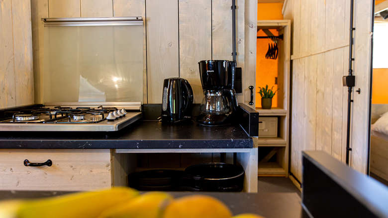 The Family Lodge for twelve people is fully equipped and has two bathrooms, a spacious kitchen that includes a fridge, coffee machine and combi-microwave, a decorative fireplace, and two cosy seating areas where everyone can relax in comfort.