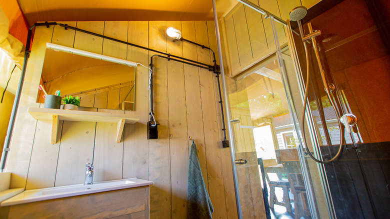 There are four self-contained bedrooms: two double bedrooms with a double bed and two rooms with two bunkbeds each for four people. The beds feature luxurious mattresses. The bedrooms include an en-suite shower, washbasin, and toilet. Unfortunately, it is not possible to place a cot in the bedrooms.