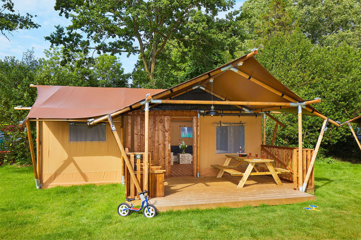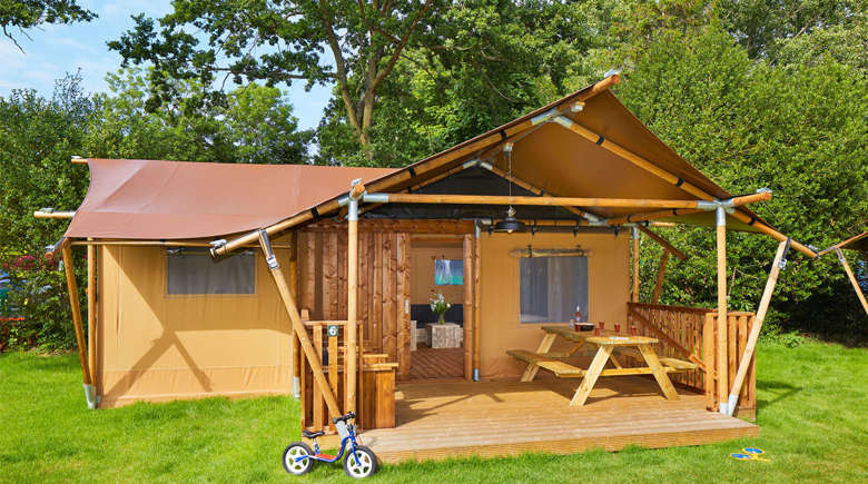 You will enjoy a comfortable comping holiday in our newest 5-person Lodge Tents. These Lodge Tents come with all amenities and can be found on the Romantic Camp. You will enjoy the outdoors life to its full extent thanks to the scaffolding wood furniture and the covered veranda.