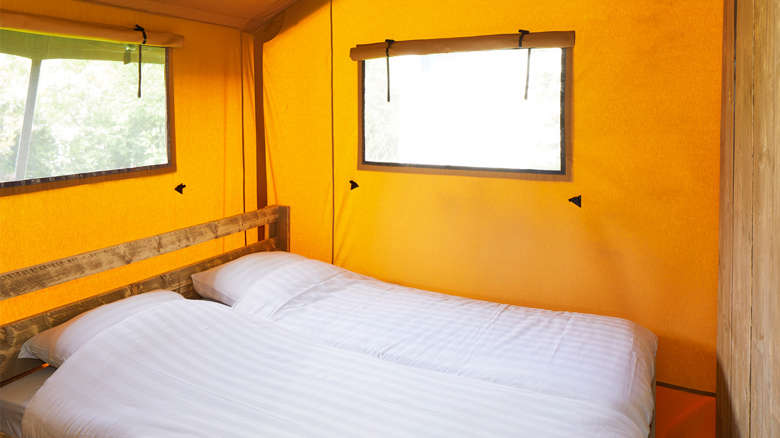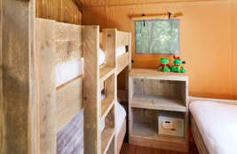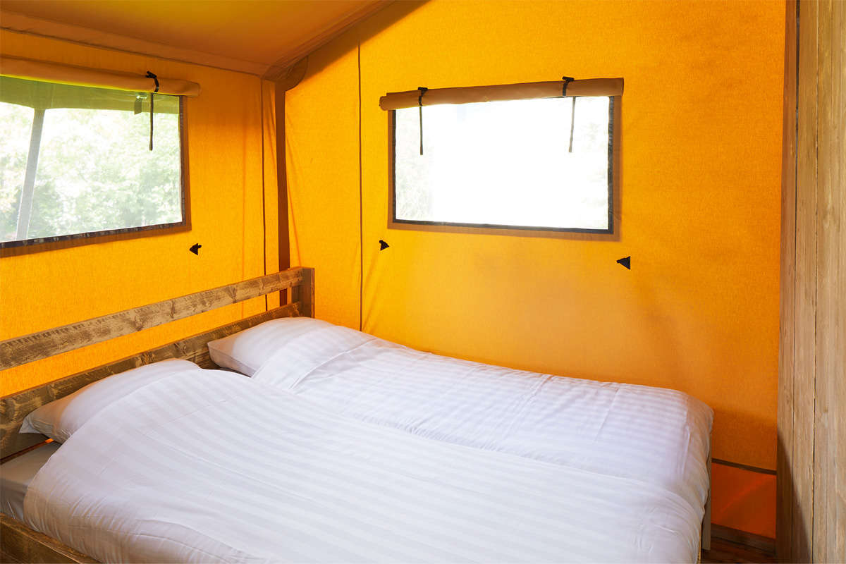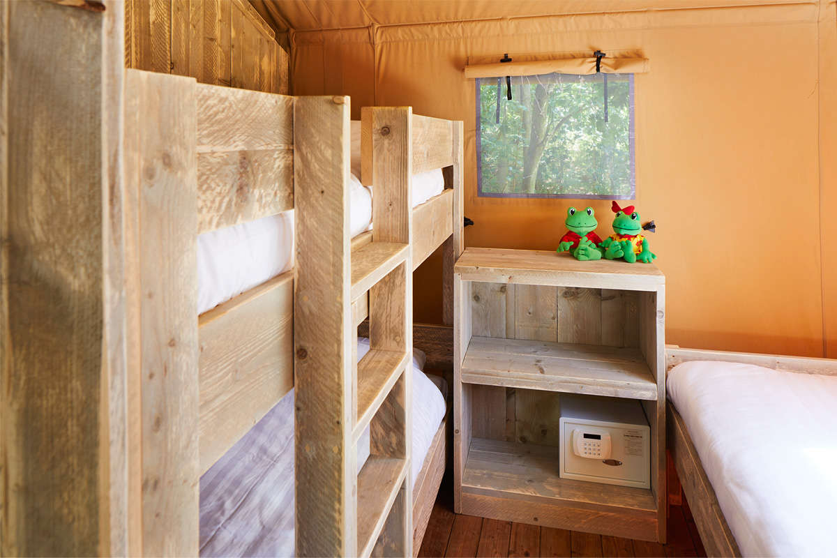 The Lodge Tent has two bedrooms. A bedroom for two people with a double bed and a bedroom with a bunk bed and single bed. The beds come with luxury matresses. A possible baby cot cannot be placed in the bedrooms.