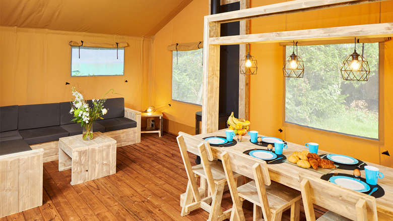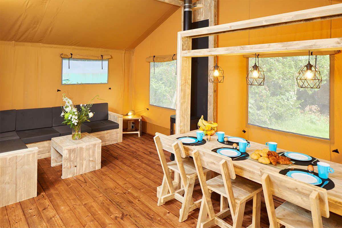 The new Lodge Tents for 5 people come with a kitchen equipped with a fridge, freezer compartment and coffee maker. There’s a spacious seating- and dining area. The Lodge Tents also have a separate toilet.
