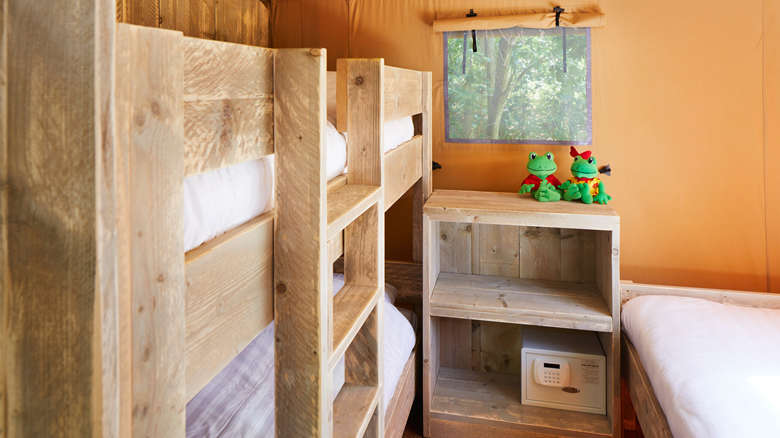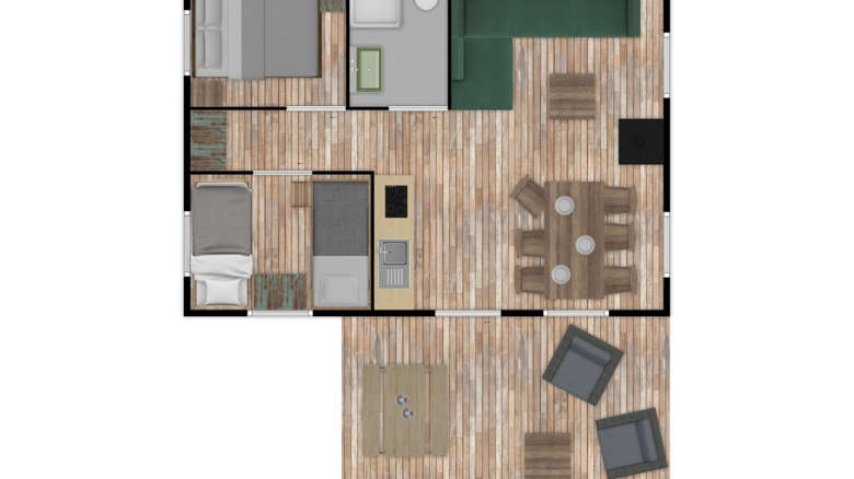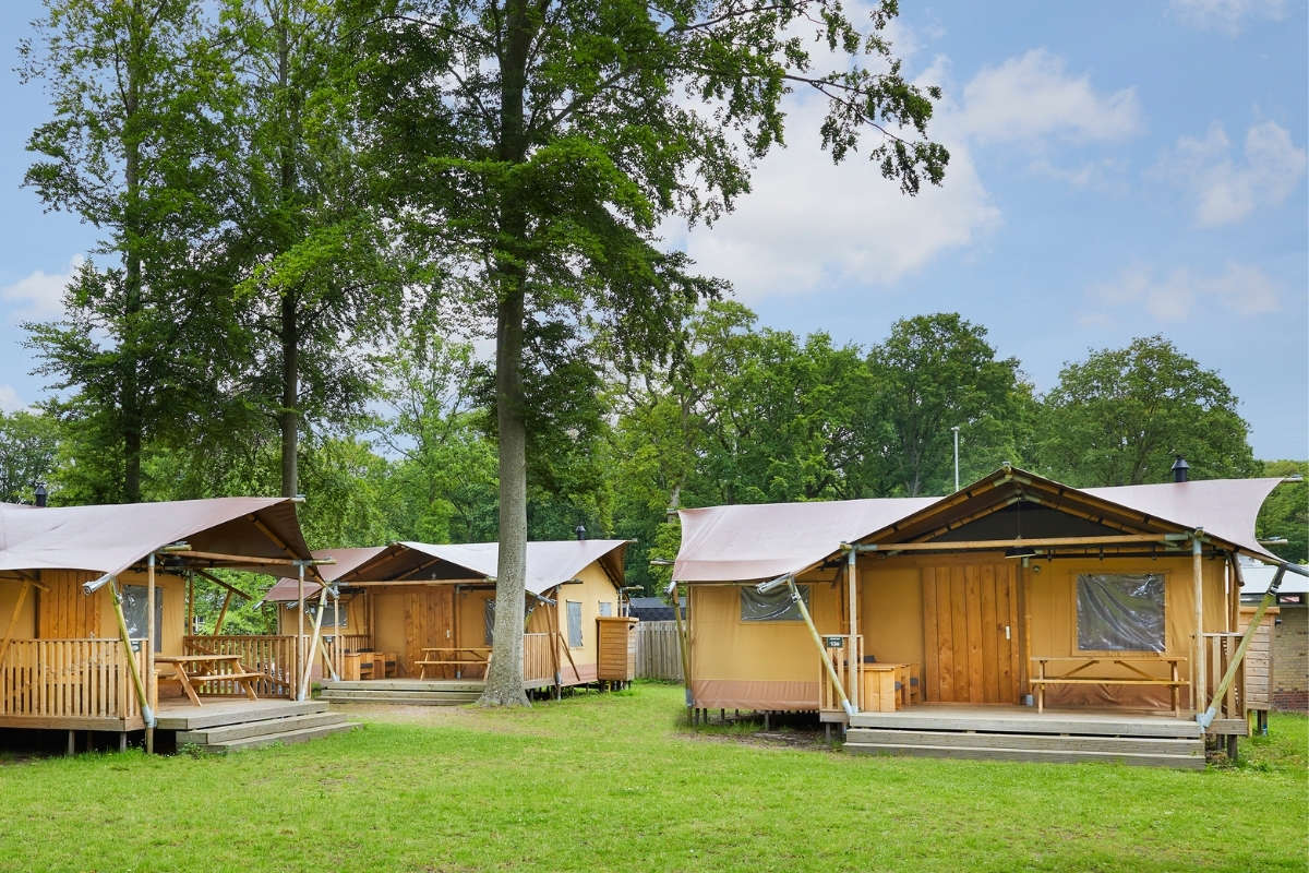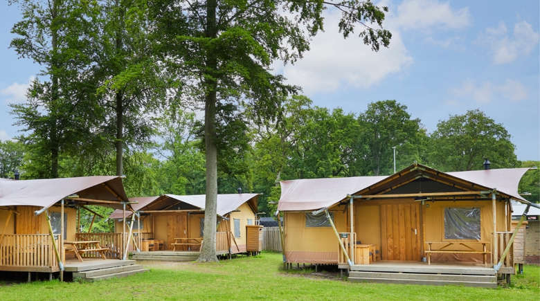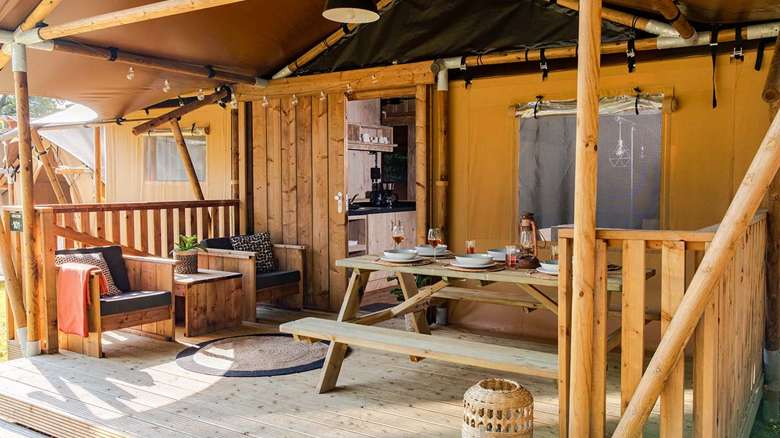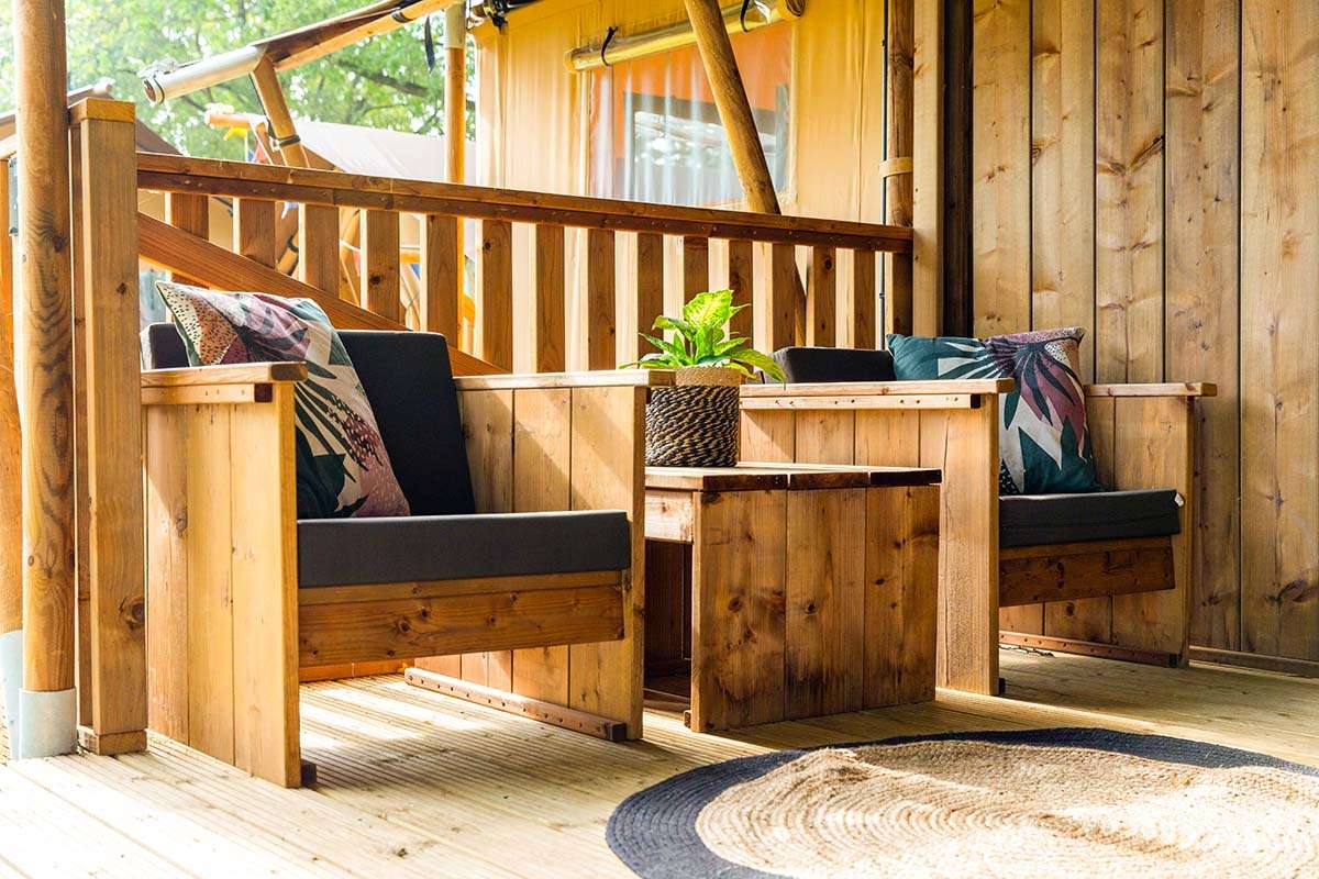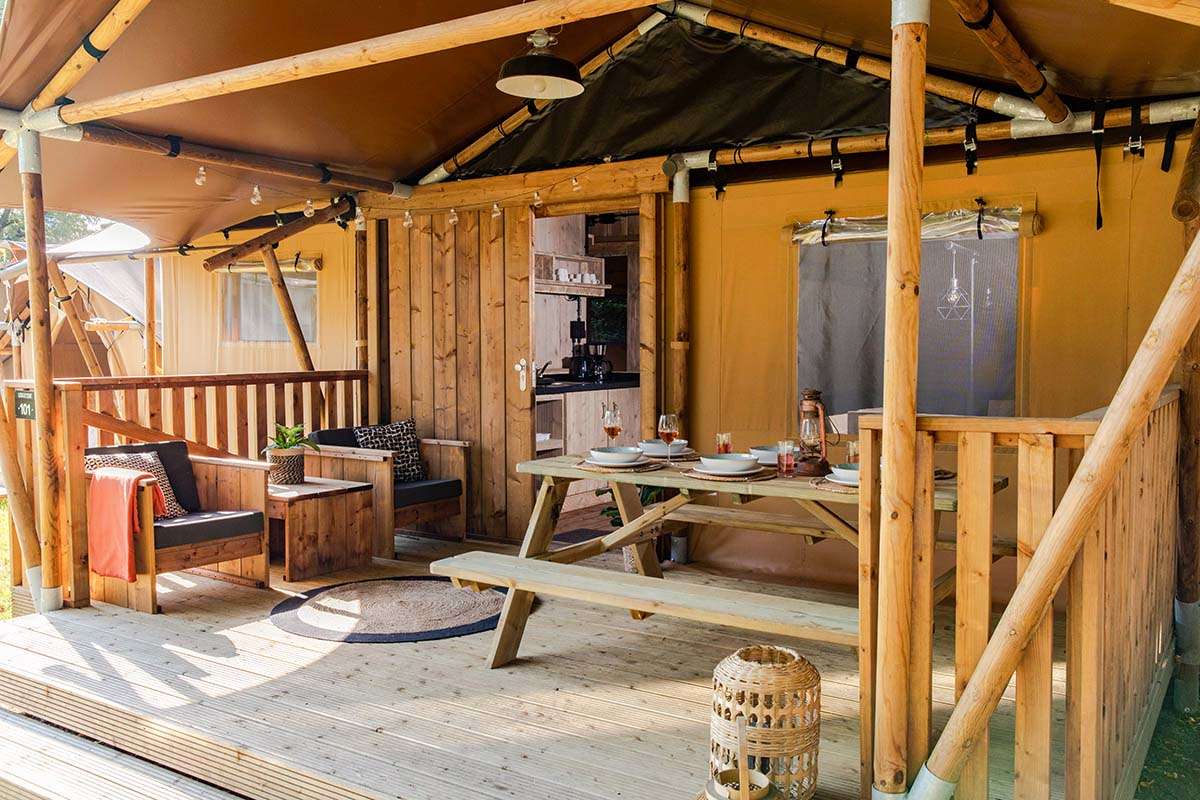 Enjoy a comfortable comping holiday in our newest 5-person Luxury Lodge Tents! These lodges come with all amenities. You will enjoy the outdoors life to its full extent thanks to the scaffolding wood furniture and the covered veranda.