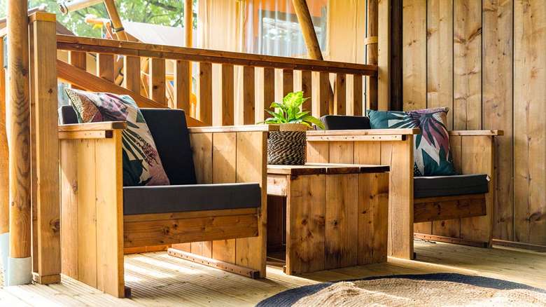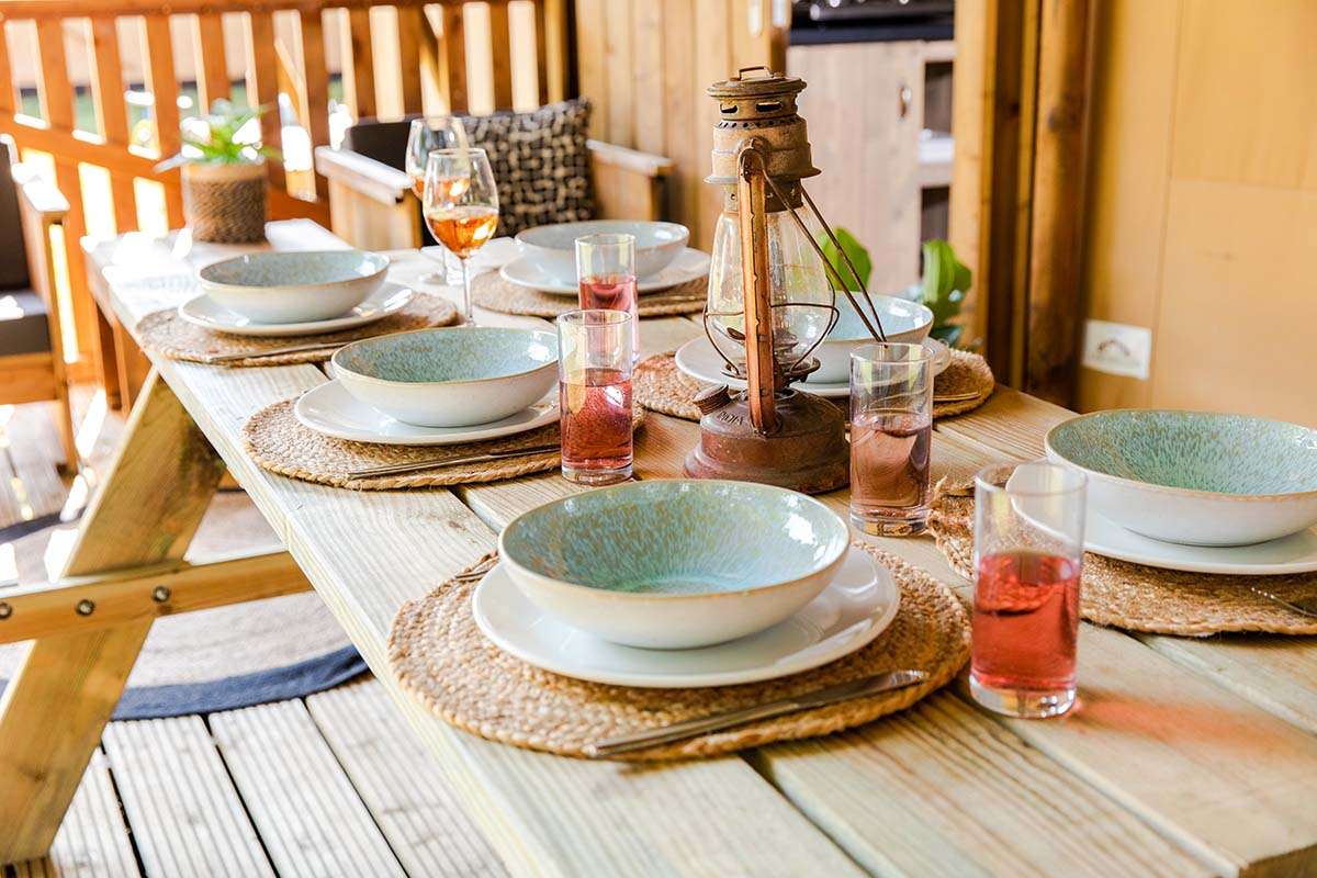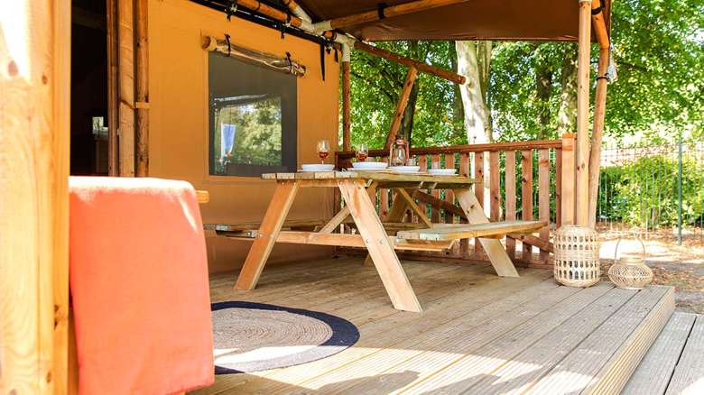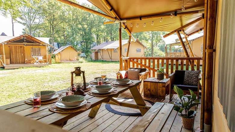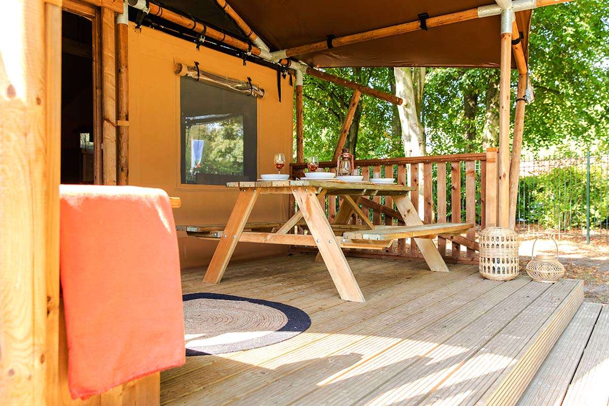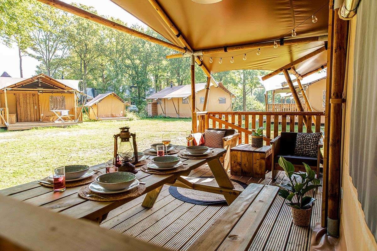 A spacious veranda with a covered part is attached to our new Lodge Tents. The veranda has a picnic table and two lounge chairs, for ultimate enjoyment of the outdoors. When you want to take a shower there’s a sanitary building only a minute away.