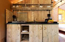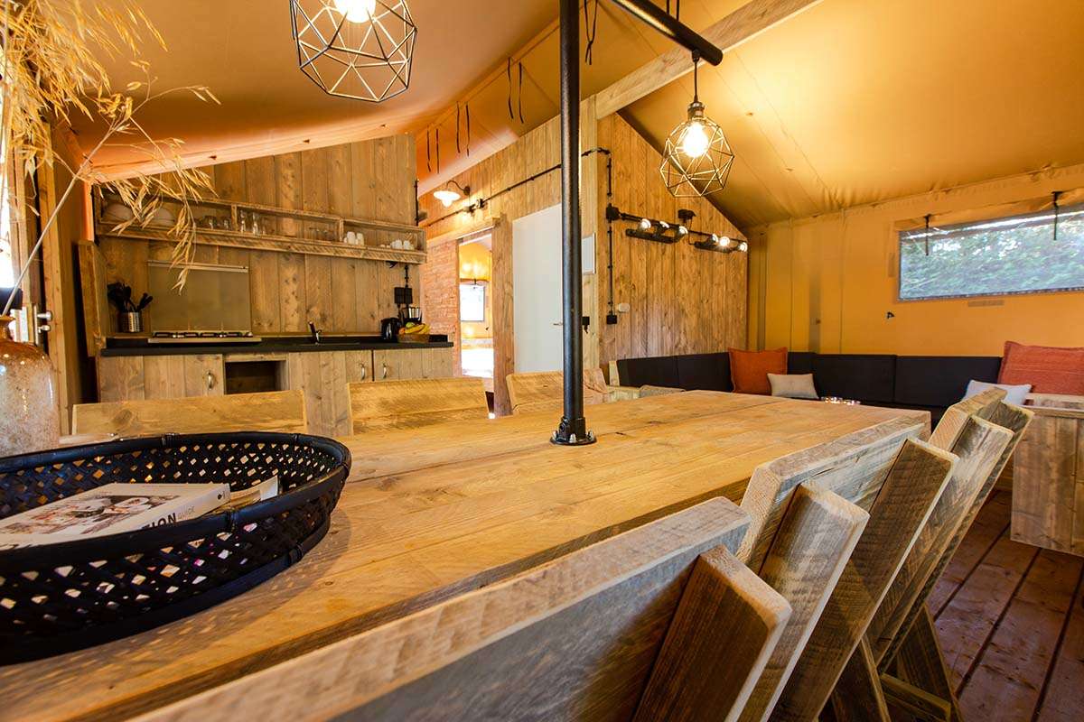 These Luxury Lodge Tents for 5 people come with a kitchen equipped with a fridge, freezer compartment and coffee maker. There’s a spacious seating- and dining area. The Lodge Tents also have a separate toilet with a washstand.