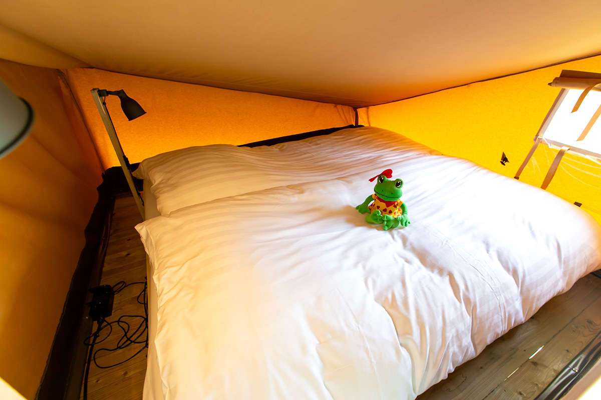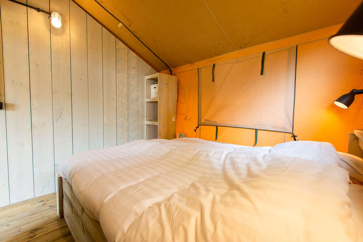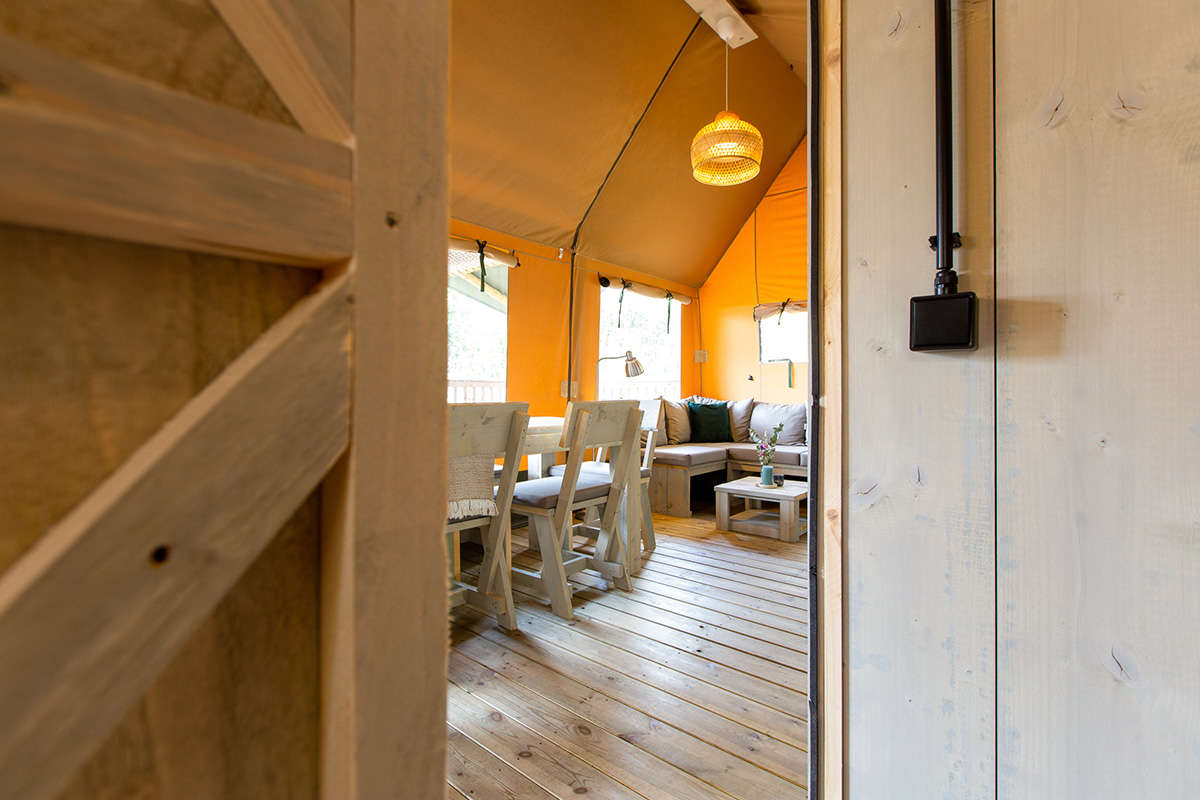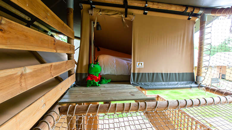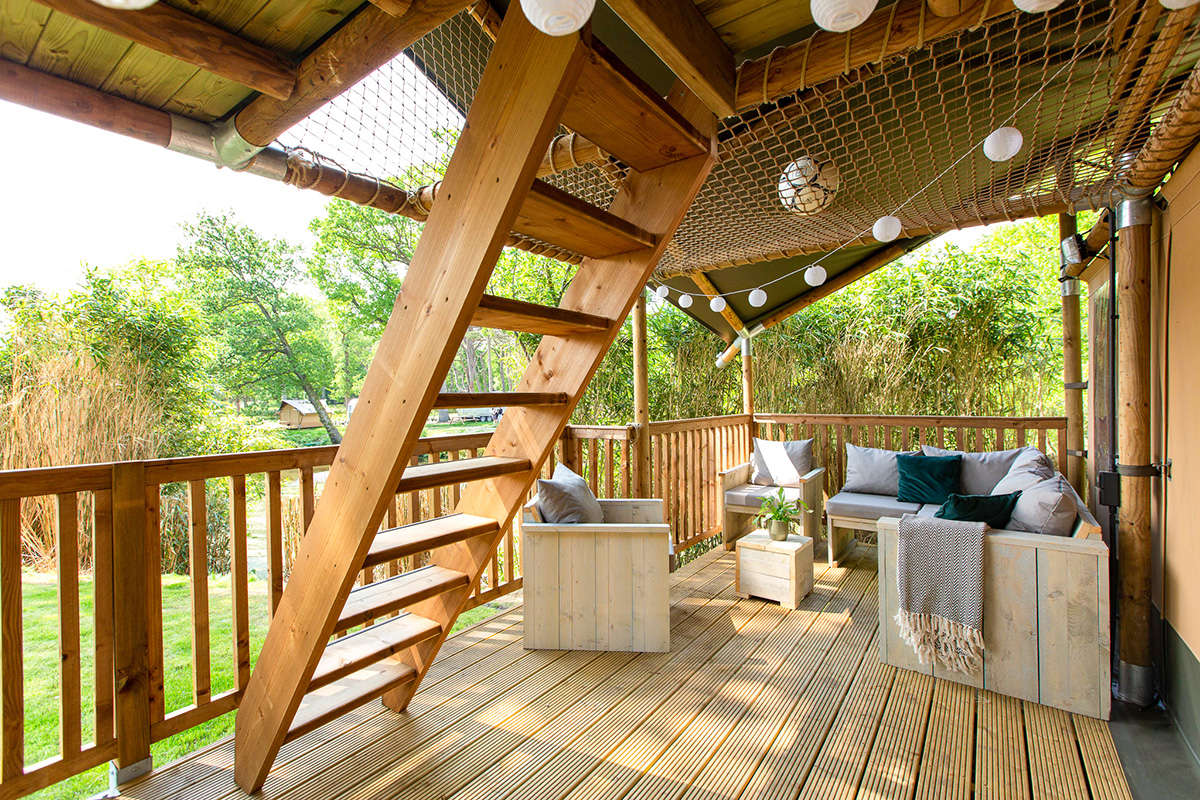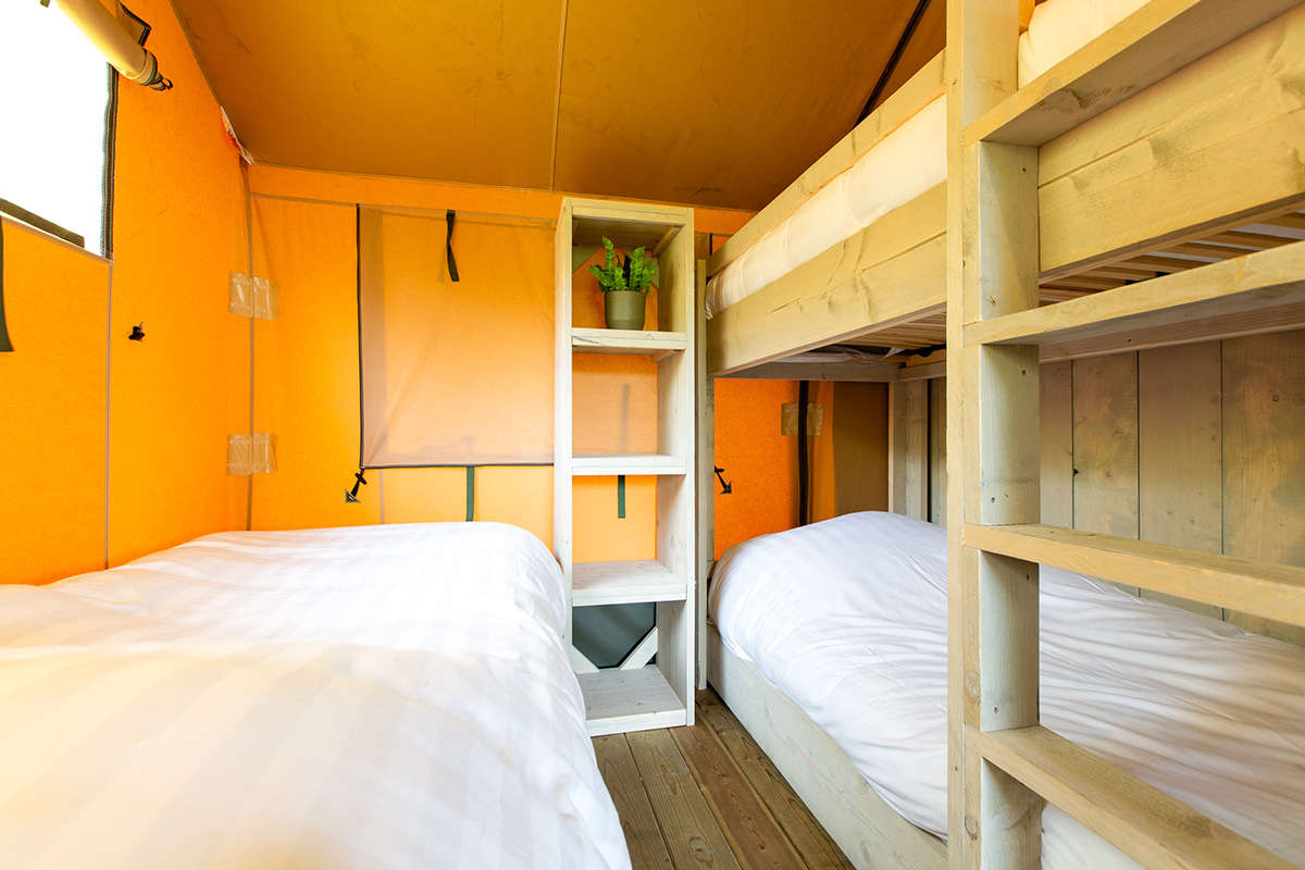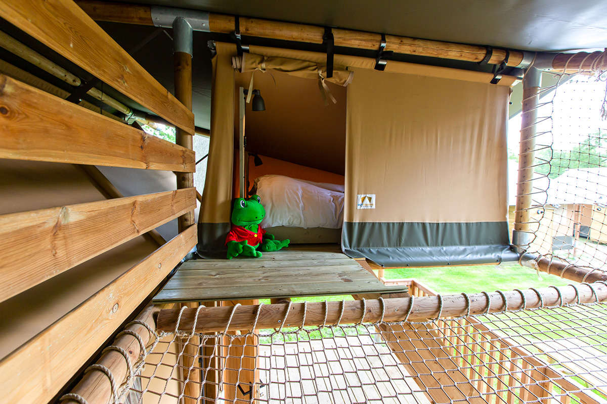 The Lodge tent has three bedrooms. Two bedrooms are found on the ground floor: one with a double bed and one with a single bed and bunkbed. What makes the Ranger Lodge so special is the extra two-person tent under the apex of the tent, with a play-hammock next to it. Especially fun for children as it gives the feel of sleeping in a treehouse. All beds feature luxurious mattresses. Unfortunately, it is not possible to place a cot in the bedrooms.