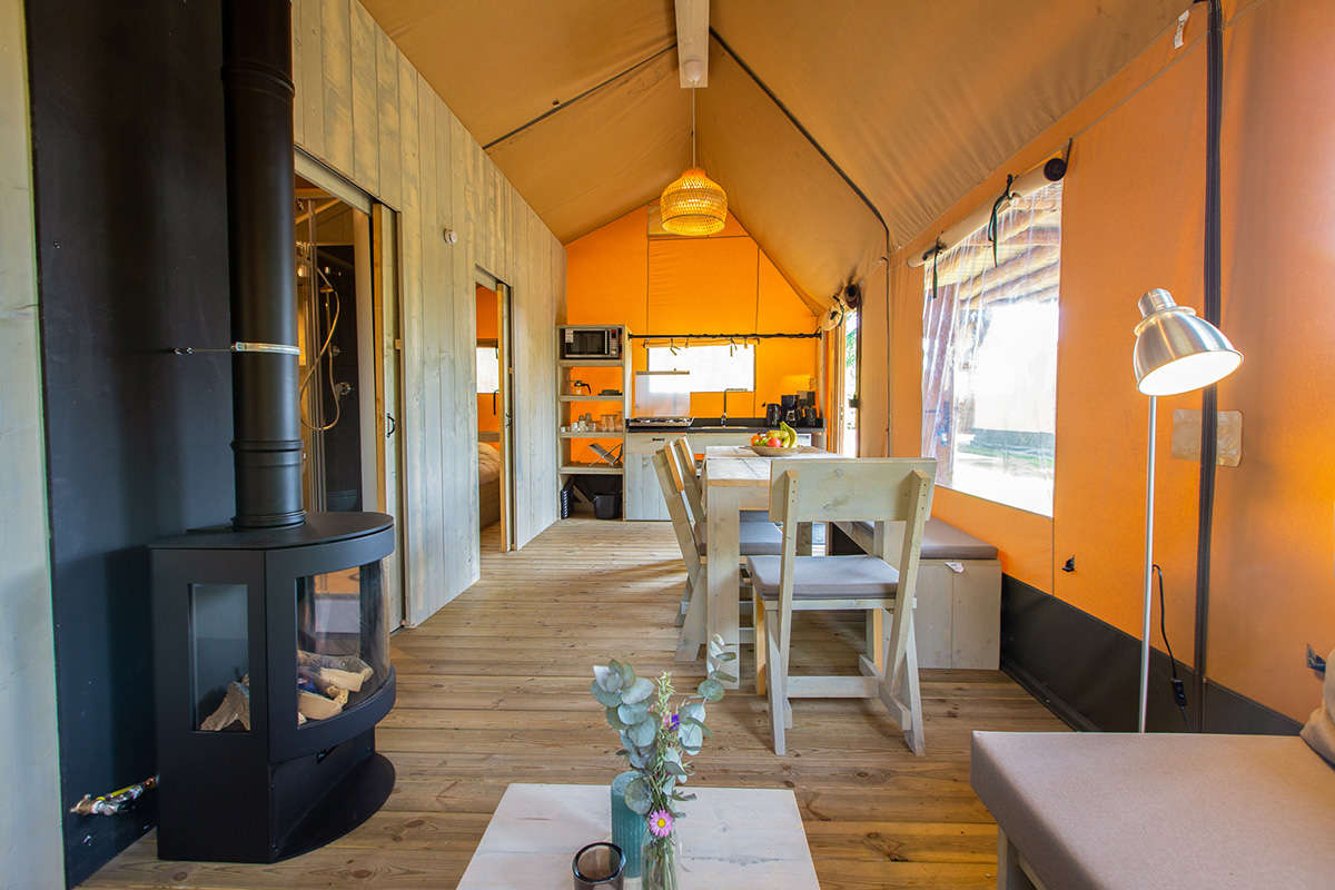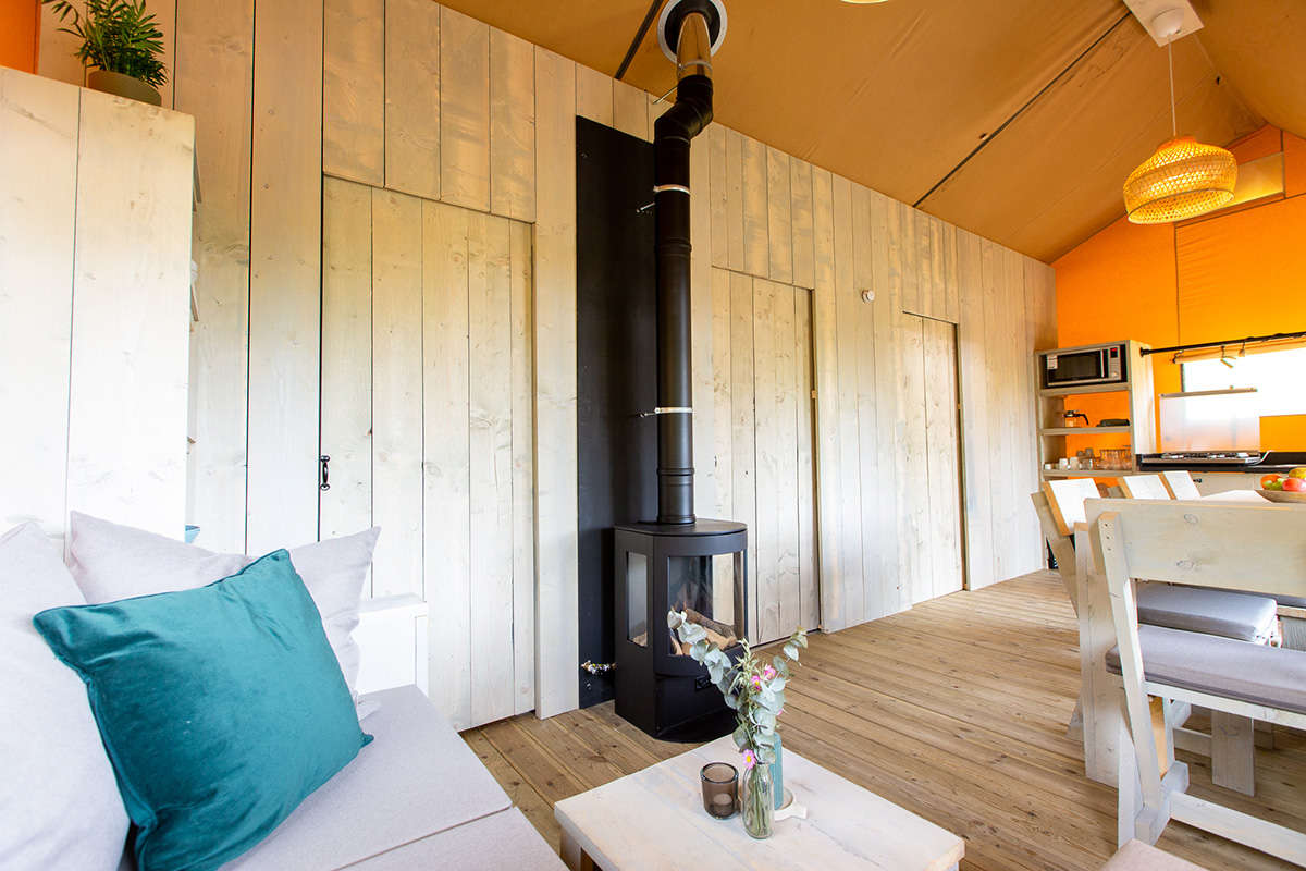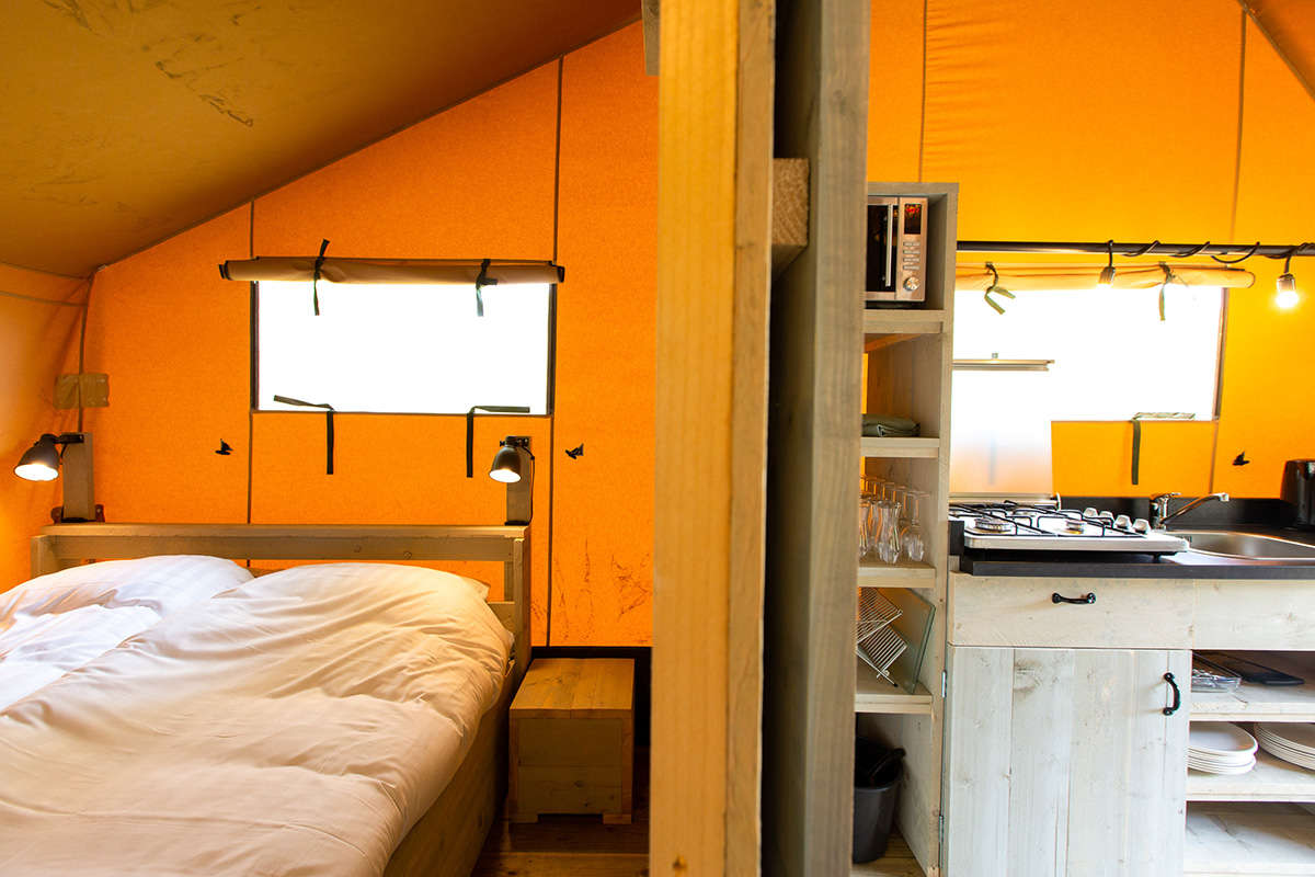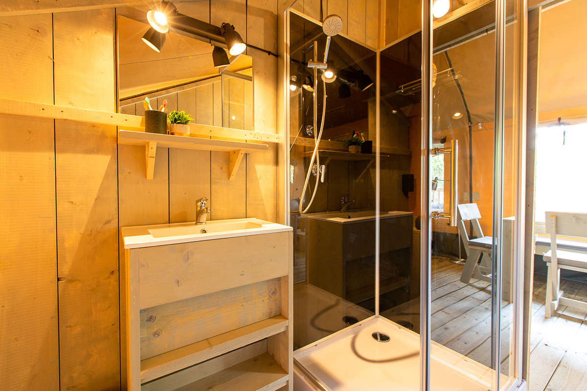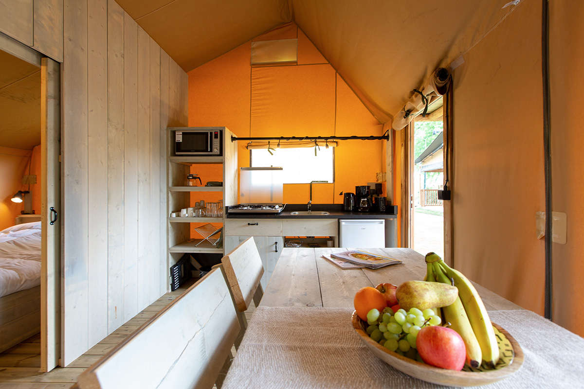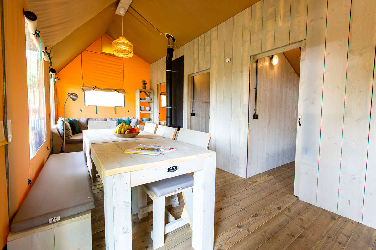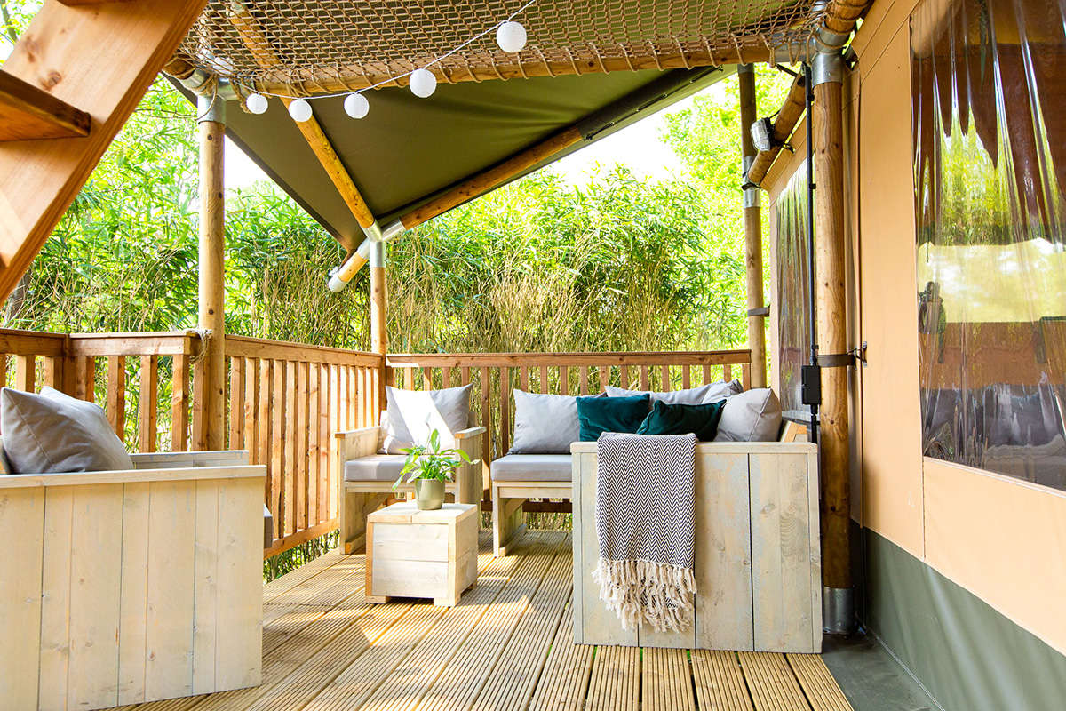 The Lodge tent has three bedrooms. Two bedrooms are found on the ground floor: one with a double bed and one with a single bed and bunkbed. What makes the Ranger Lodge so special is the extra two-person tent under the apex of the tent, with a play-hammock next to it. Especially fun for children as it gives the feel of sleeping in a treehouse. All beds feature luxurious mattresses. Unfortunately, it is not possible to place a cot in the bedrooms.