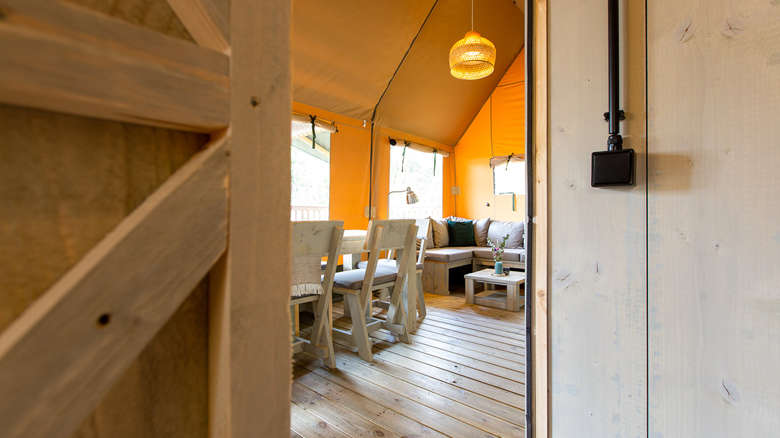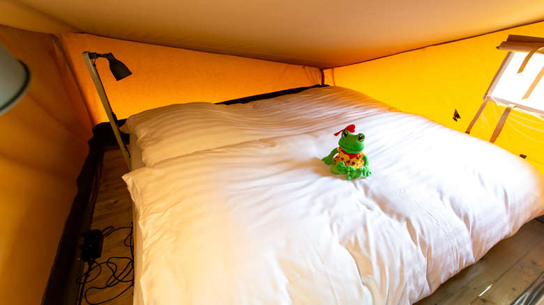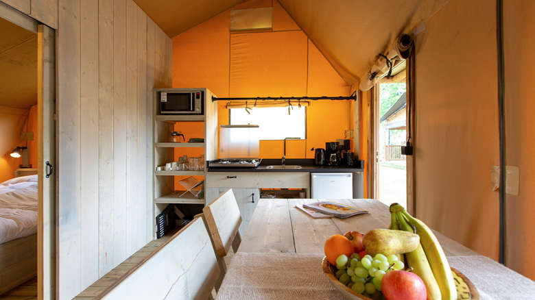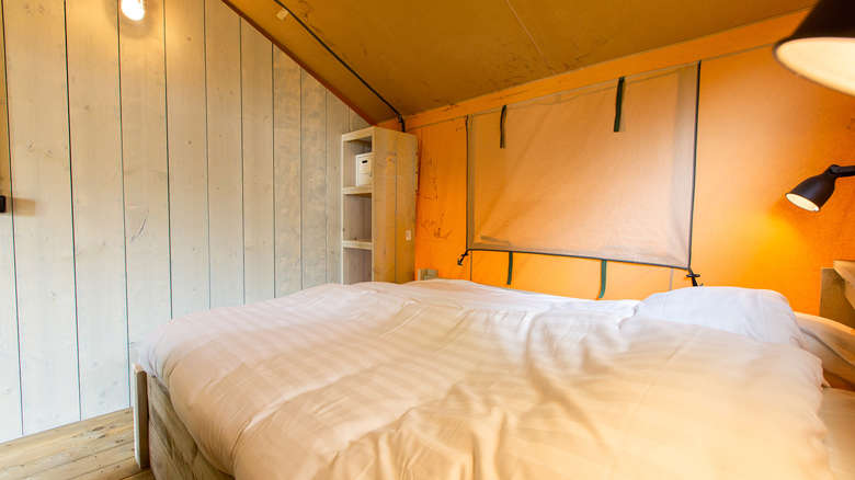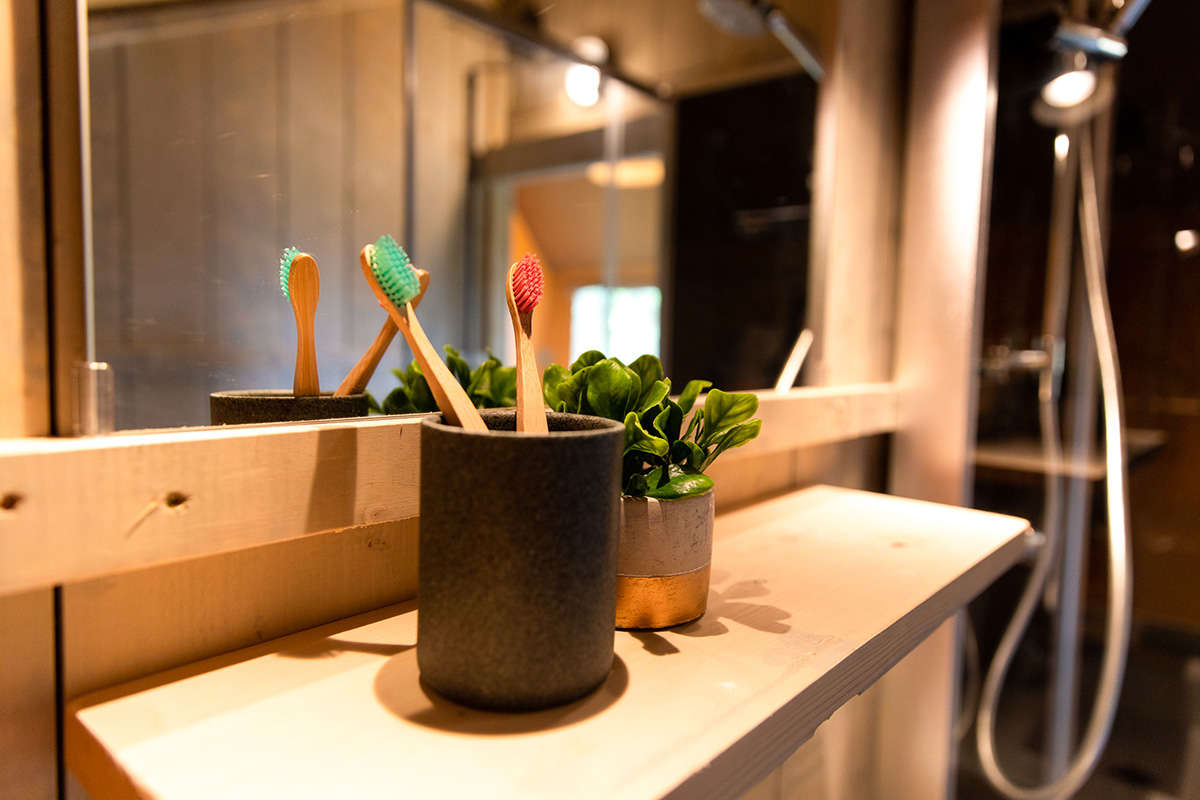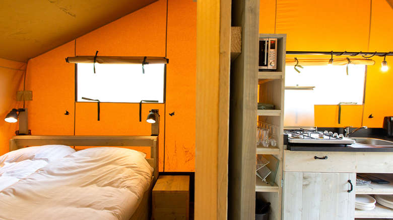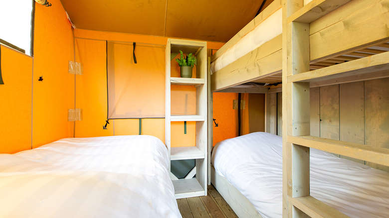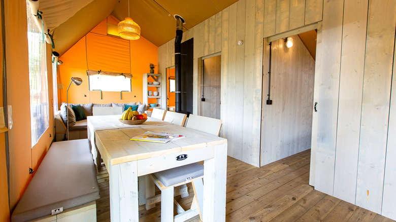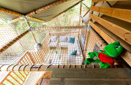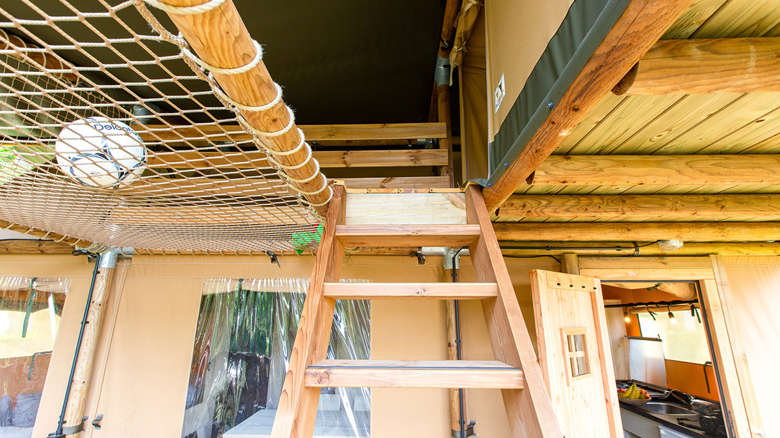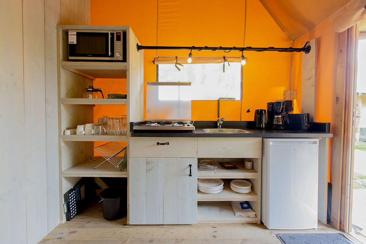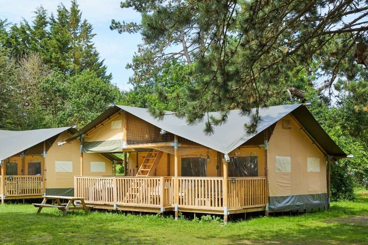 The Lodge tent has three bedrooms. Two bedrooms are found on the ground floor: one with a double bed and one with a single bed and bunkbed. What makes the Ranger Lodge so special is the extra two-person tent under the apex of the tent, with a play-hammock next to it. Especially fun for children as it gives the feel of sleeping in a treehouse. All beds feature luxurious mattresses. Unfortunately, it is not possible to place a cot in the bedrooms.