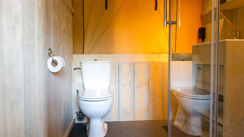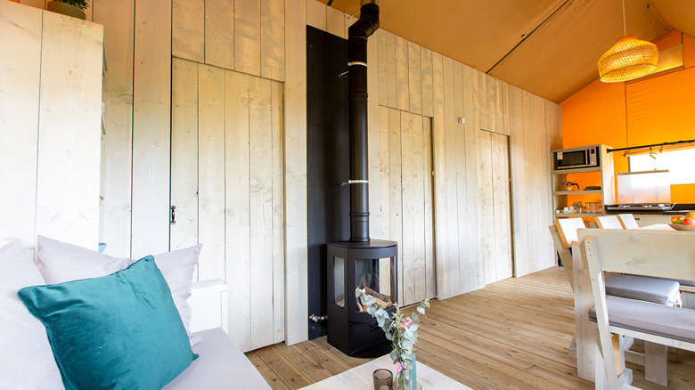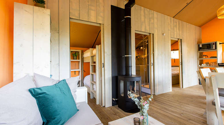 The Ranger Lodge makes maximum use of the space and is equipped with everything you need. You have a private bathroom with shower, toilet and washbasin, a fully equipped kitchen that includes a gas hob, microwave and fridge, a decorative fireplace, and a cosy living and eating area. The living area has large windows that allow plenty of natural light in.